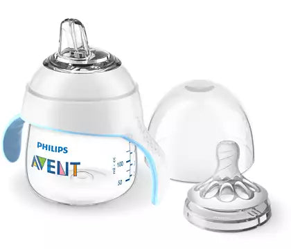 This Natural trainer kit eases your baby into their first cup. The comfort grips help your baby hold the bottle independently while drinking from the familiar nipple. When ready, switch to the silicone spout to complete the transition.