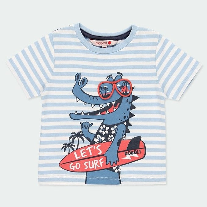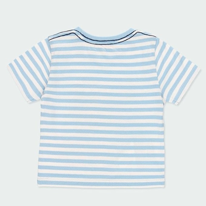 t - shirt in plain jersey with light blue and white stripes. The decoration is a print on the front of the in various colors. Available in size 6 months to 6 years.