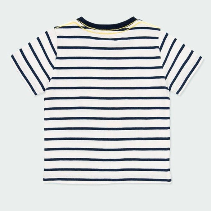 t - shirt in plain knitted navy blue and white stripes. The decoration is a pattern and an application in blue and yellow tones. Available in size 6 months to 6 years.