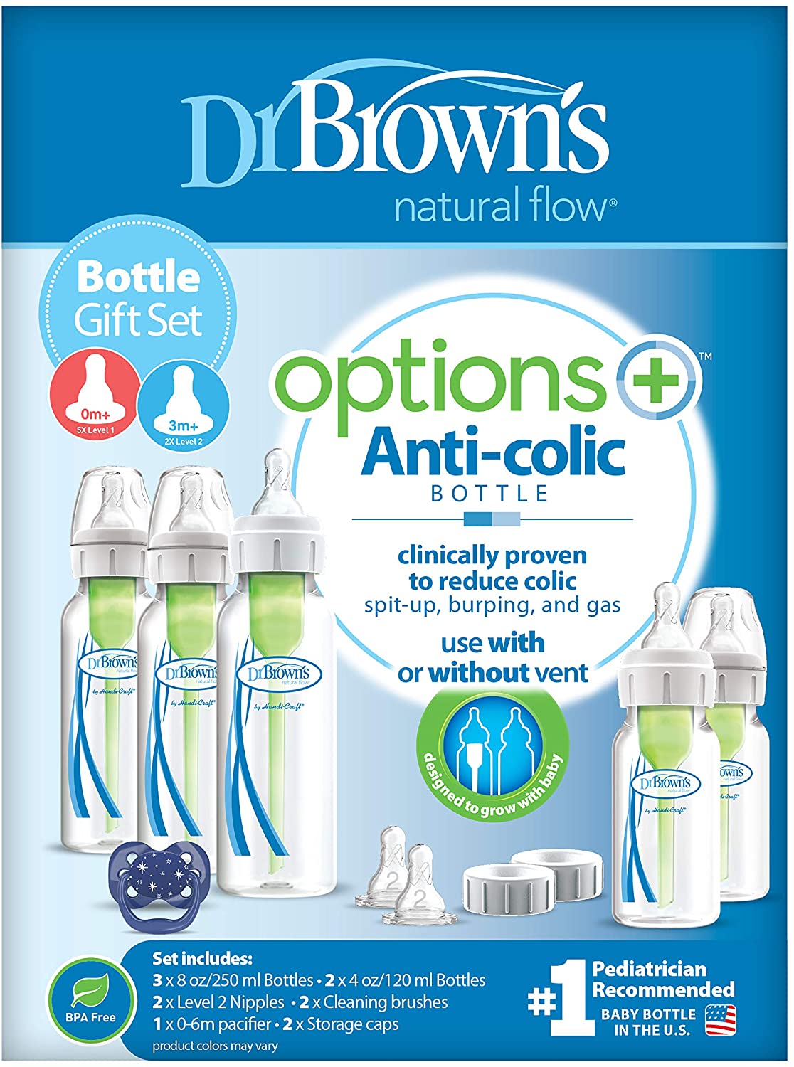• Includes (3) 8 oz options bottles with level 1 nipples; (2) 4 oz options bottles with level 1 nipples; (1) prevent butterfly pacifier