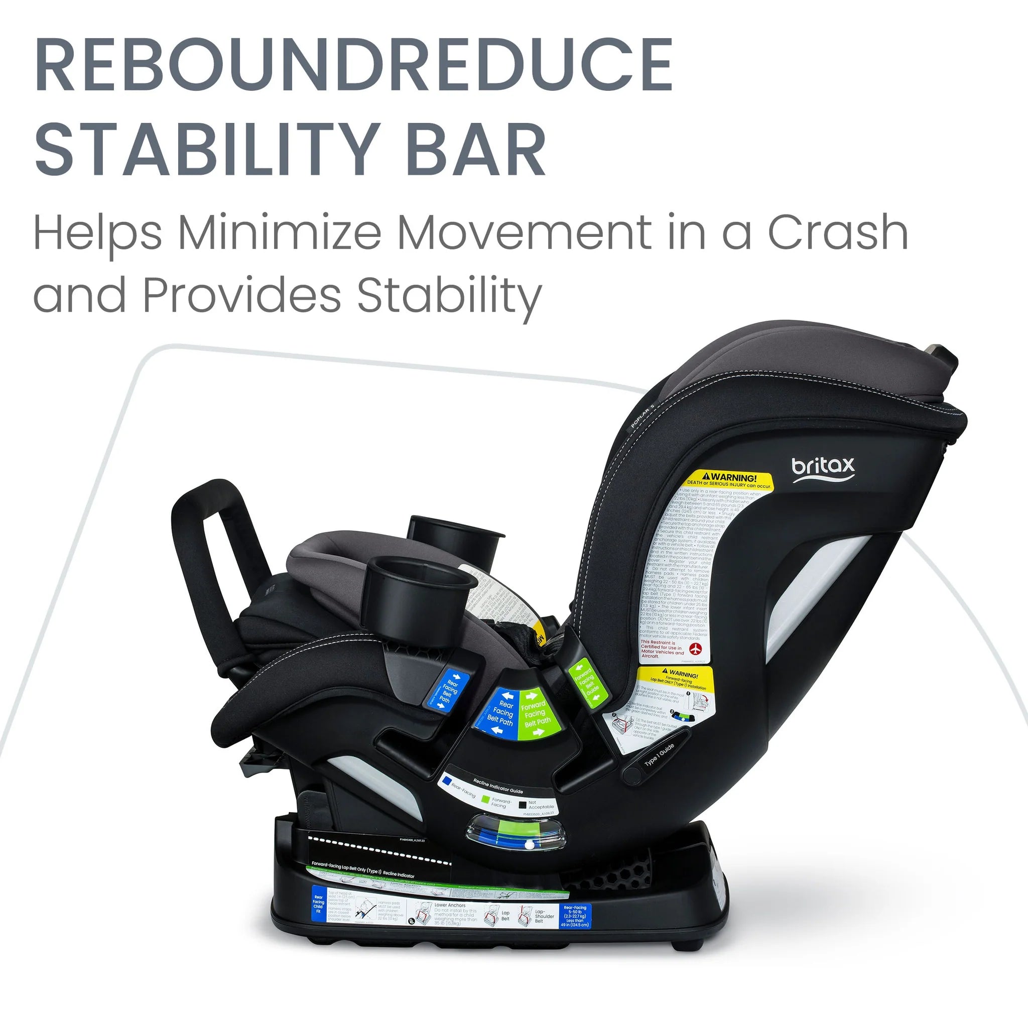 ReboundReduce™ Stability Bar is a carbon steel bar that easily attaches to the car seat when installed rear-facing. It minimizes the movement in the event of a crash; it must be removed when installed forward-facing