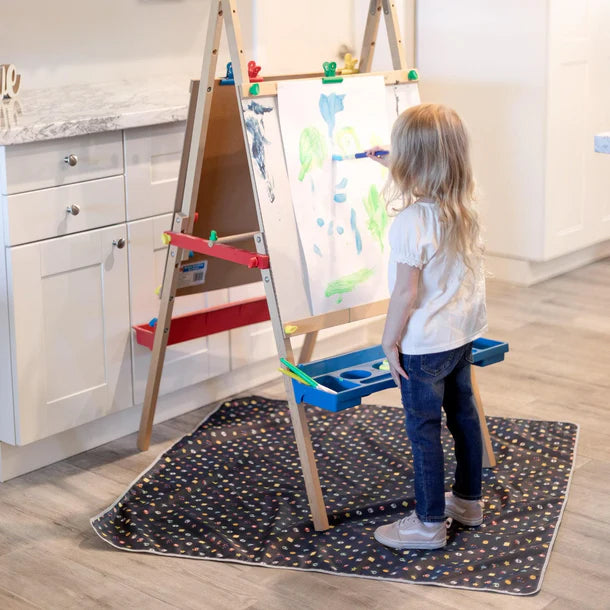 Our splat mats have you covered! They’re made to protect your floors and tables from mealtime spills and playtime messes. Not just for underneath highchairs. Use it on floors, on tables or outside. And, they’re great for art projects. Made from the same easy-wipe waterproof and stain-resistant fabric as Bumkins award-winning SuperBib. The single-ply construction means no worrying about icky stuff growing between layers of fabric. A generous 42”x42” yet lightweight, it takes up less space in your bag, so you can take it where you need it! Wipeable and machine washable for easy cleaning so you can use it over and over again!