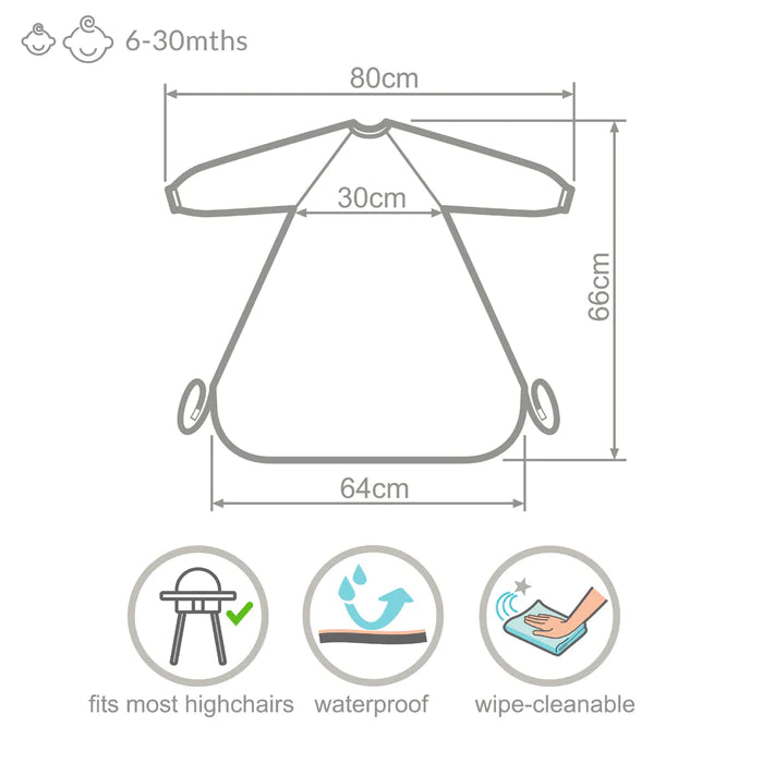 The amazing gold award-winning Wipeezee XL Coverall bib covers baby's arms, body and the highchair table, keeping both perfectly clean during messy mealtimes! Food and drinks are safely caught in the 'pocket' recess between the child's front and the highchair table; ideal for self-feeding and baby-led weaning. After use, everything can be wiped off for a sparkly clean finish, ready for the next meal!