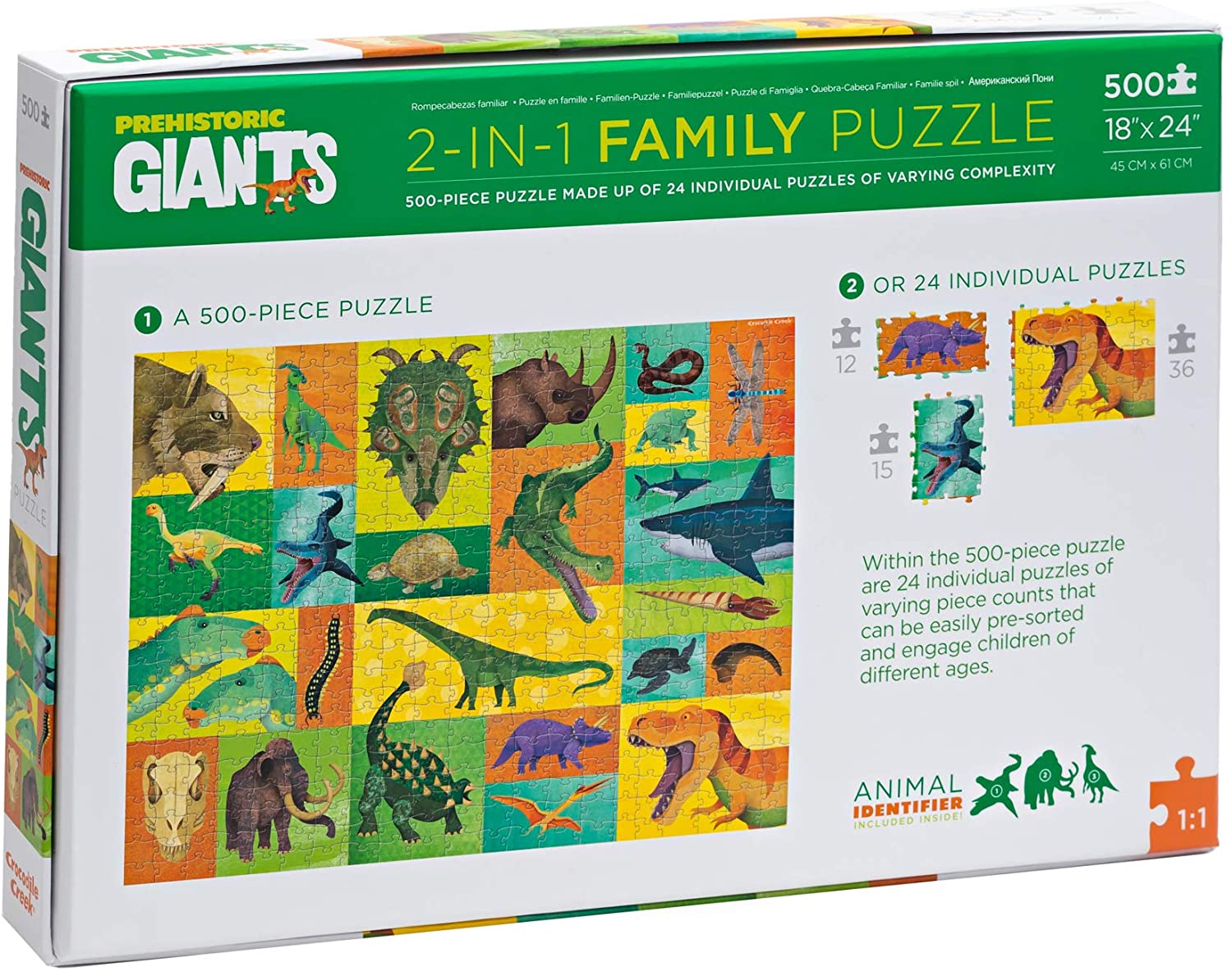 Here come the giants with Animal Giants family puzzles from Crocodile Creek! These 500 piece puzzles have been designed so family members of all ages can work on the puzzle at the same time. Older children and adults can work on the large 500-piece puzzle while younger children can be engaged as they assemble the individual animal images with lower piece counts. Each puzzle also comes with an Animal Identifier sheet with fun facts about the different giant animals. This puzzle is fun and educational! For ages for 4 years and up.