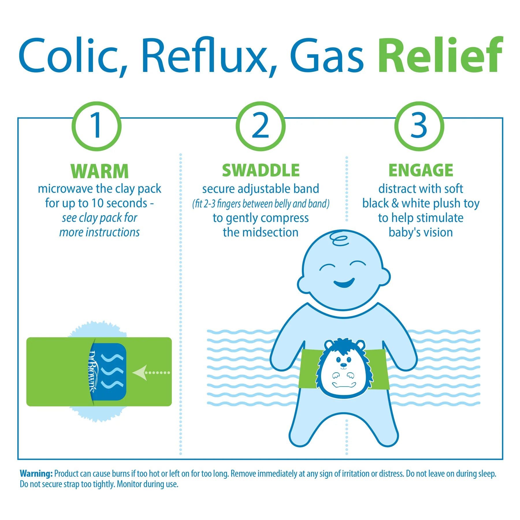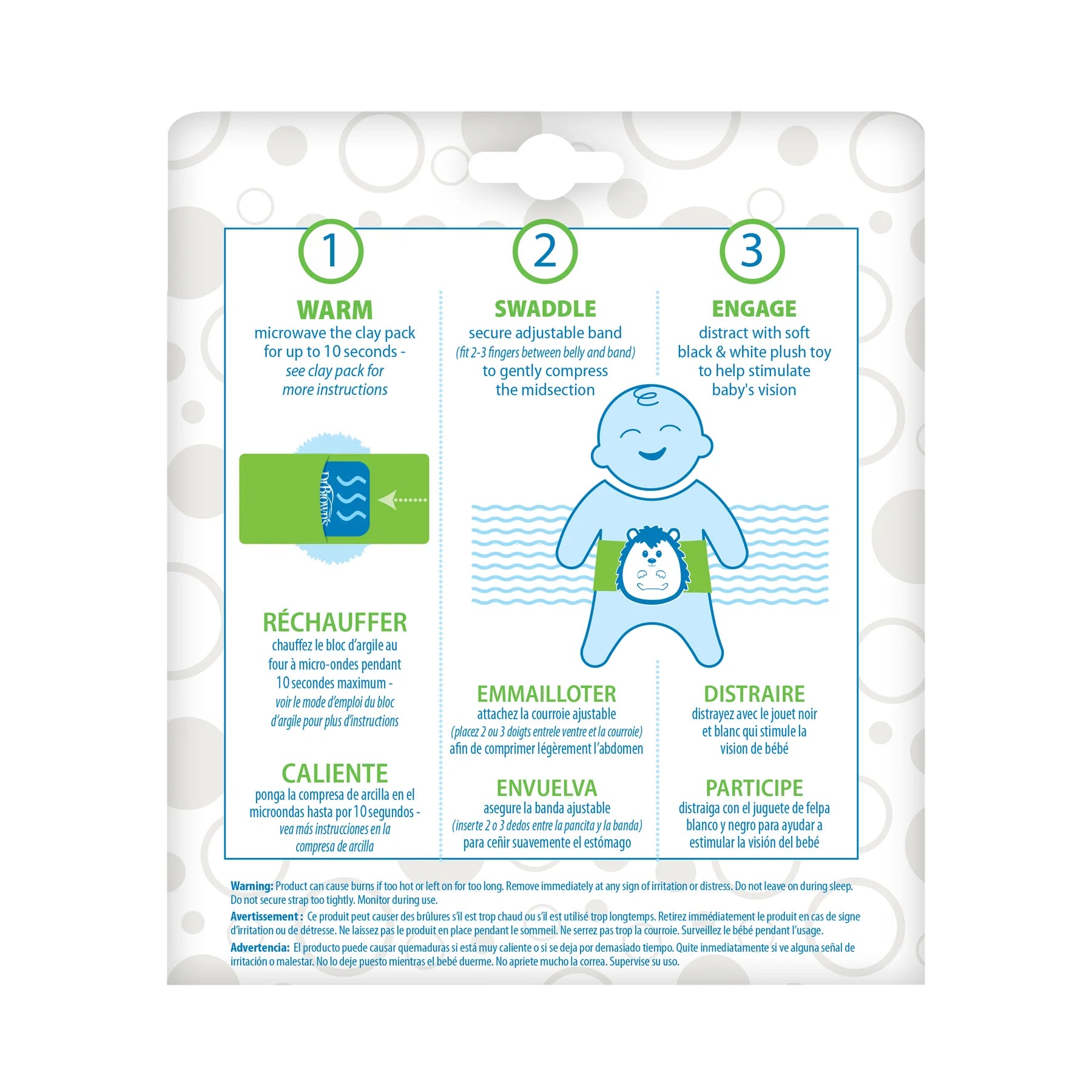 The doctor-designed adjustable heated tummy wrap provides warmth and a gentle compression to help comfort an upset stomach. The baby heating pad uses extra-soft fabric to comfort your baby, while the soft, snuggly character keeps baby engaged. The Gripebelt belly band provides comfort externally without the struggle of giving baby medicine or medication. And it's easy to use! Simply warm the clay pack in the microwave for 10 seconds, insert the warmed pack into the belt, and secure the adjustable band to gently compress baby's belly.