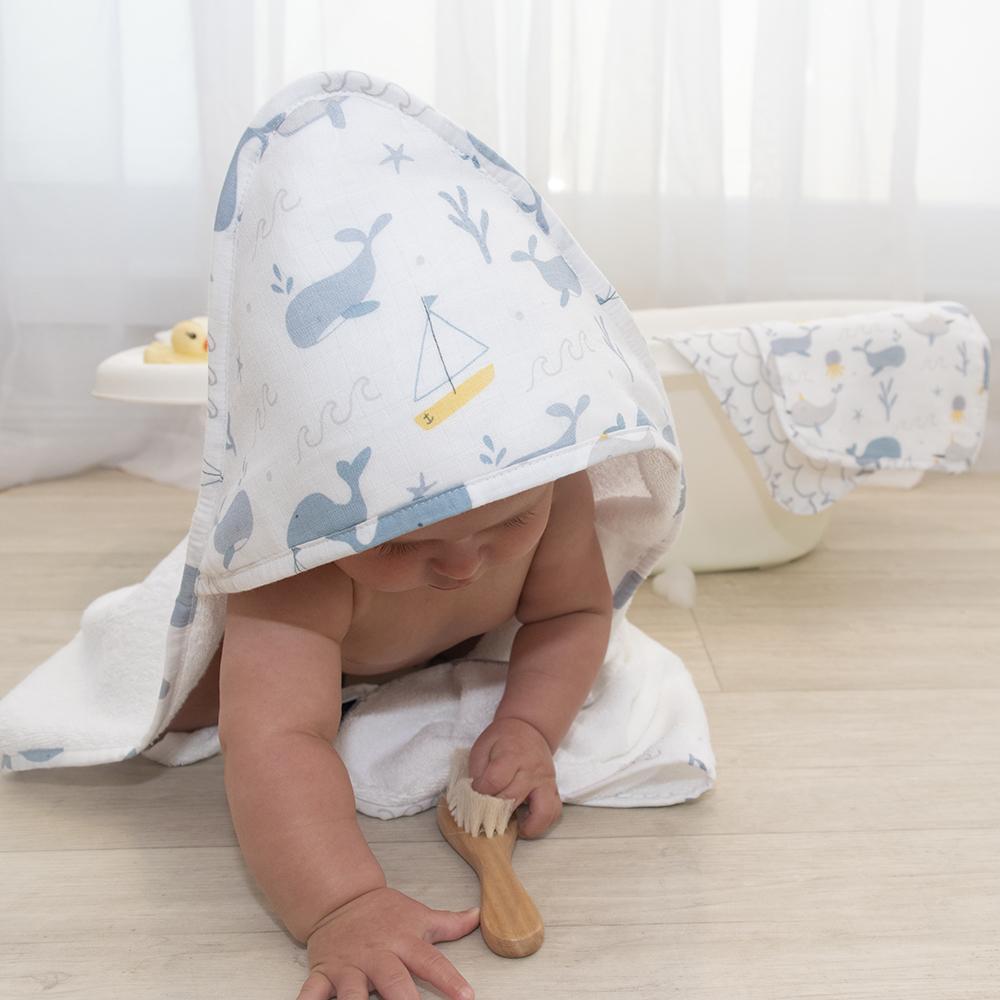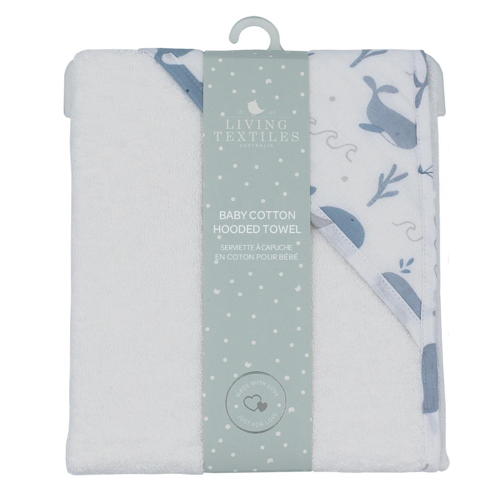The Whale of a Time cotton baby hooded towel combines function and form by featuring the cutest whale prints in subdued teal and grey colors. Match back with other items from the Living Textiles Whale of a Time Collection to create your dream nursery.