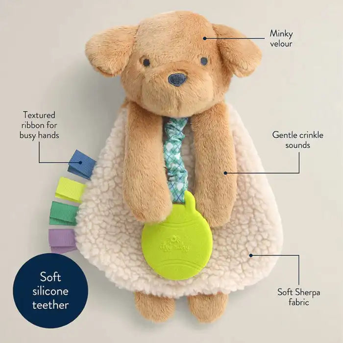 Our snuggly Itzy Friends Toy Collection Itzy Lovey™ features soft sherpa fabric and textured ribbons that baby will love to explore! A textured silicone teether helps massage and soothe sore gums, and crinkly arms and legs are sure to keep baby entertained with their gentle sound.