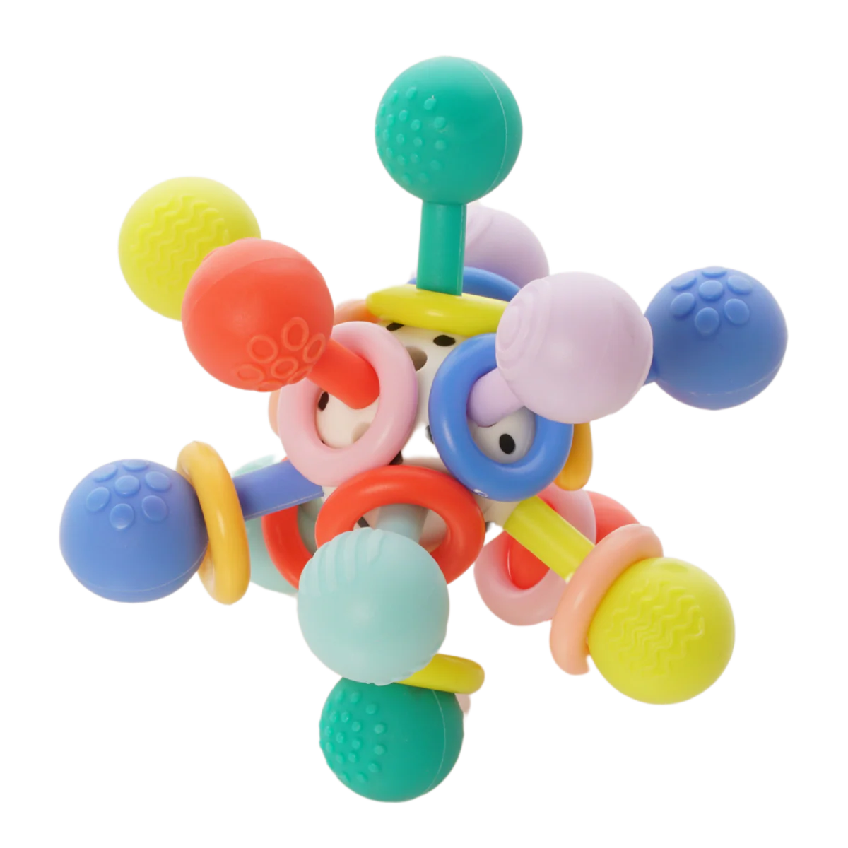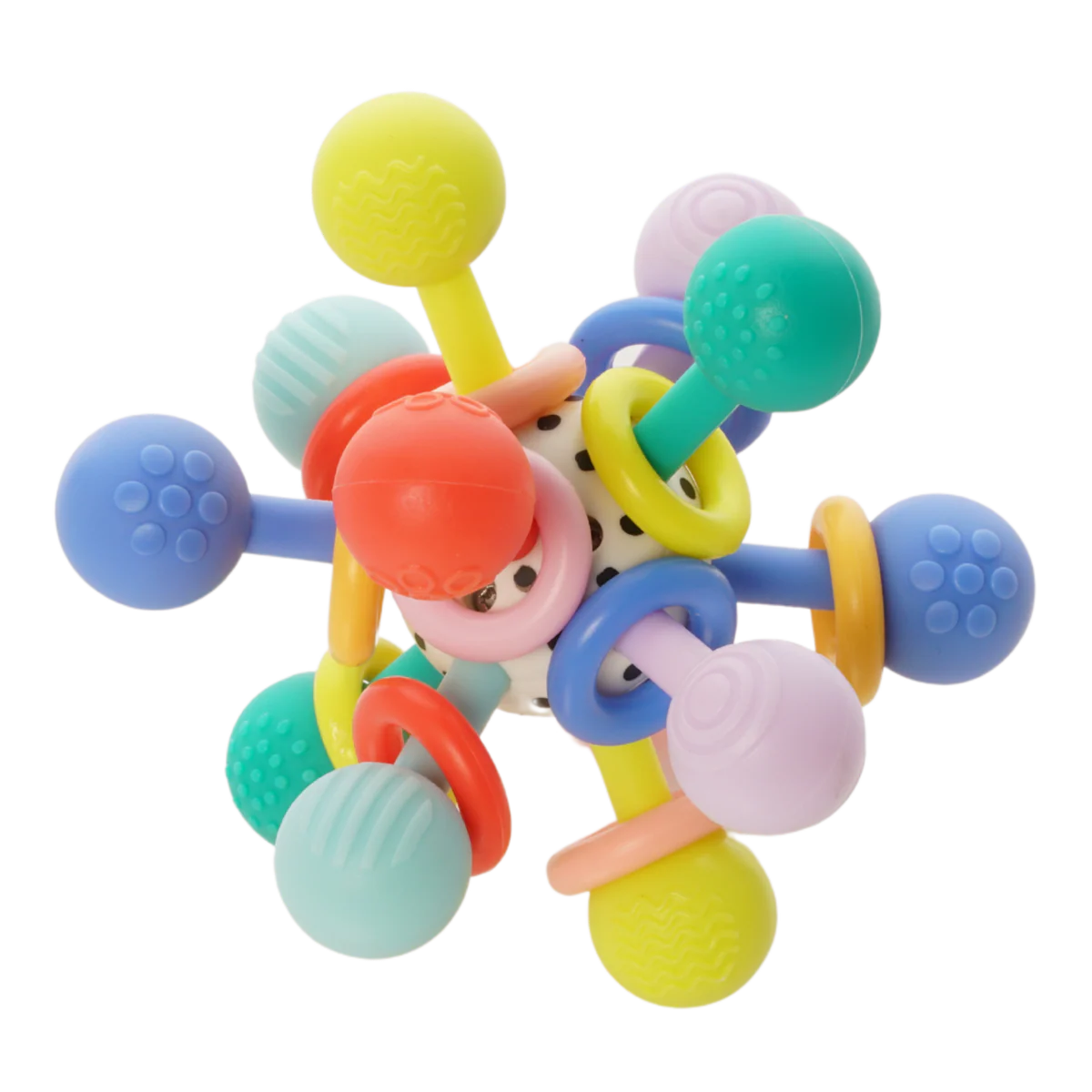A refreshed version of our award-winning Atom rattling teether toy! Twelve colorful bendy arms with textured ends stem from the round center of this easy-to grasp teether toy. Plastic clacking rings on each arm rattle with every shake. Encourage motor development, cause-and-effect learning and color exploration with this diaper-bag friendly rattling teether toy.