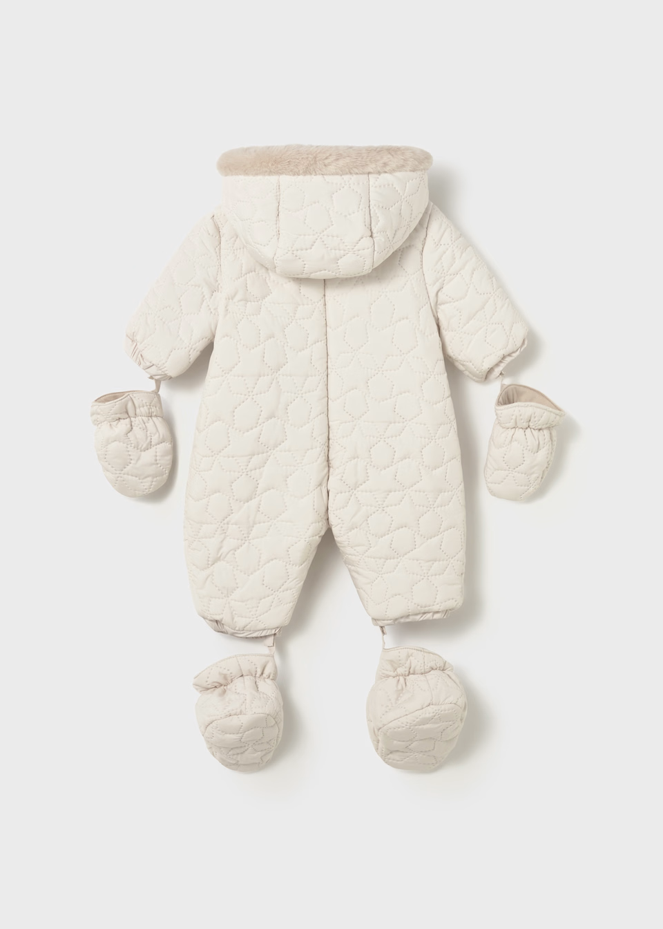 Long sleeved Snowsuit for newborn baby boy. Hood with faux fur detailing. Front, central zip fastening. Textile exterior with quilted effect.