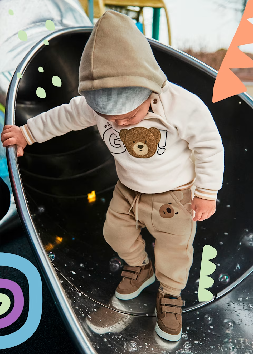 Pants for baby with maximum comfort. Elasticated waistband with adjustable drawstring. Knee pads reinforced on the inside to prevent damage in the area and offer greater resistance and durability. Elasticated hem for a better fit. Functional front pockets. Functional back pocket. Decorative elements: appliqued ears motifs, embroidery, Print.