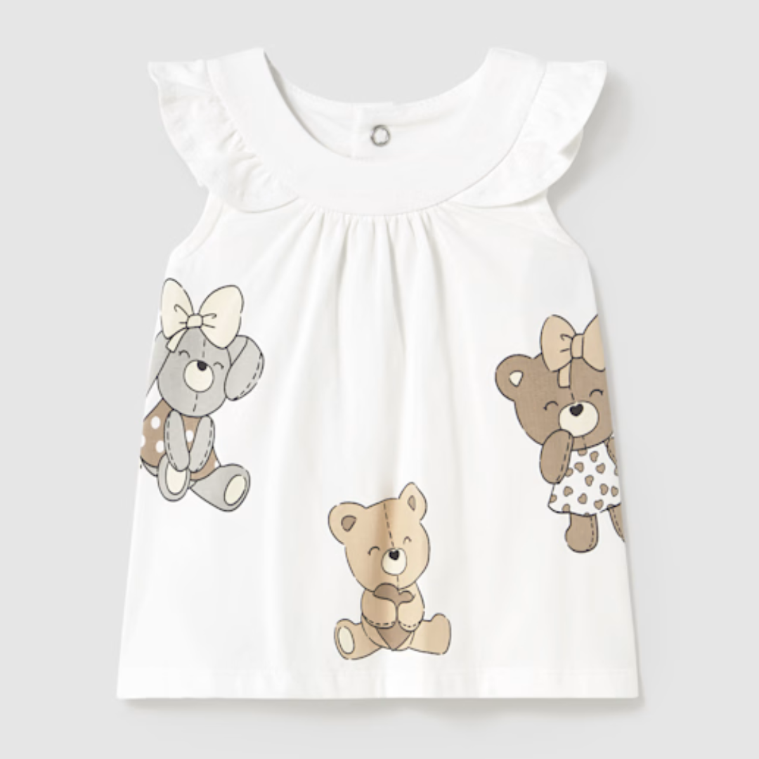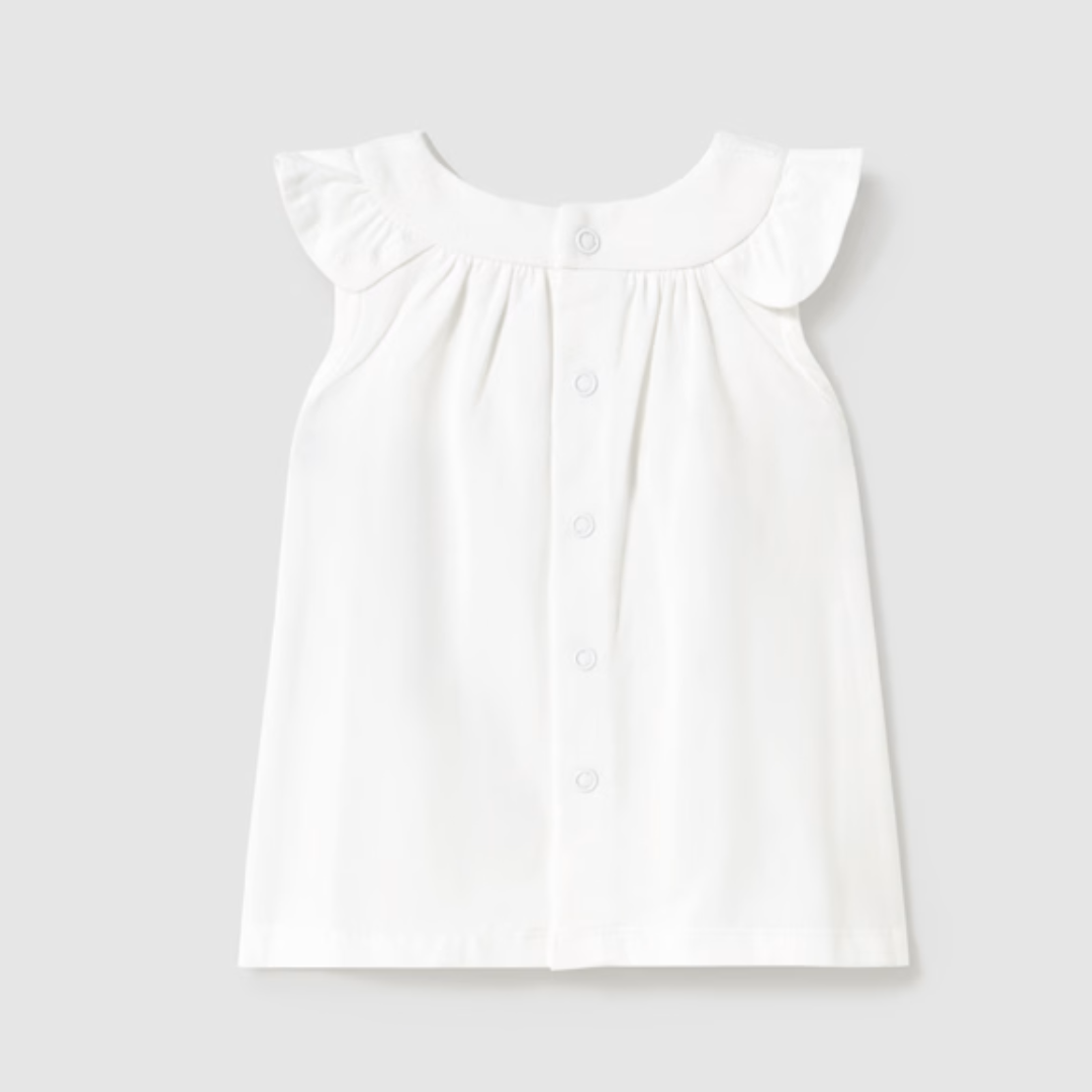 Adorable sleeveless dress for newborns. Round neck with frill detail. Button closure at the back for easy dressing. Cute printed design.