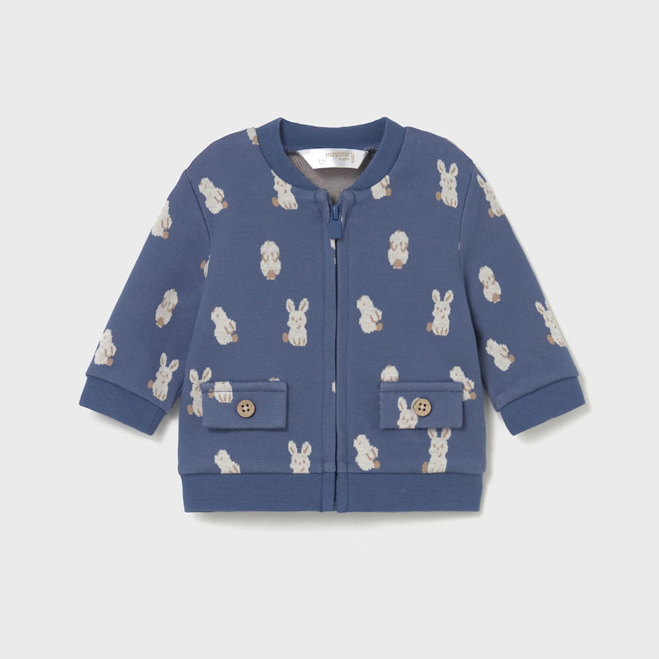 Long sleeve hoodie for newborn baby boy. Bomber style neckline. Front, central zip fastening. Decorative elements: Decorative pocket.