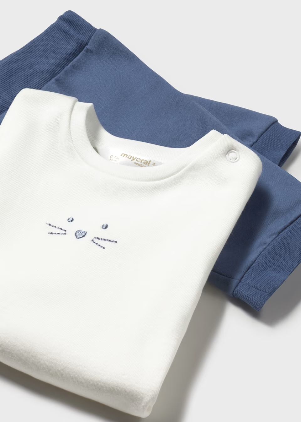 Three piece tracksuit for newborn baby boy made up of a sweatshirt, joggings bottoms and a matching t-shirt.