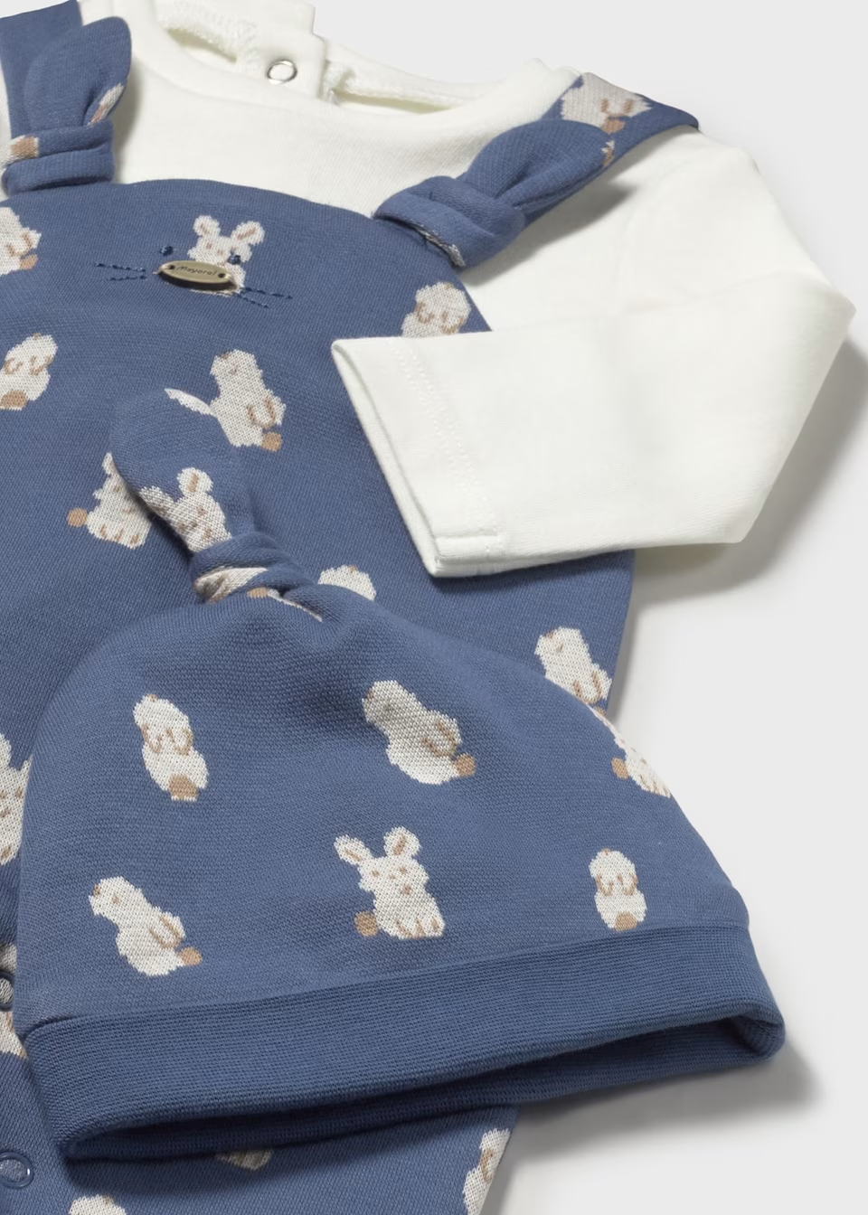 Long sleeved One-Piece for newborn baby boy. Round neckline. Designed with non-detachable dungarees. Back snap closure. Snap button fastening at crotch for easy dressing. Made from warm, elegant and sophisticated fabric to wear on the most special occasions. Garment with stretch leg.