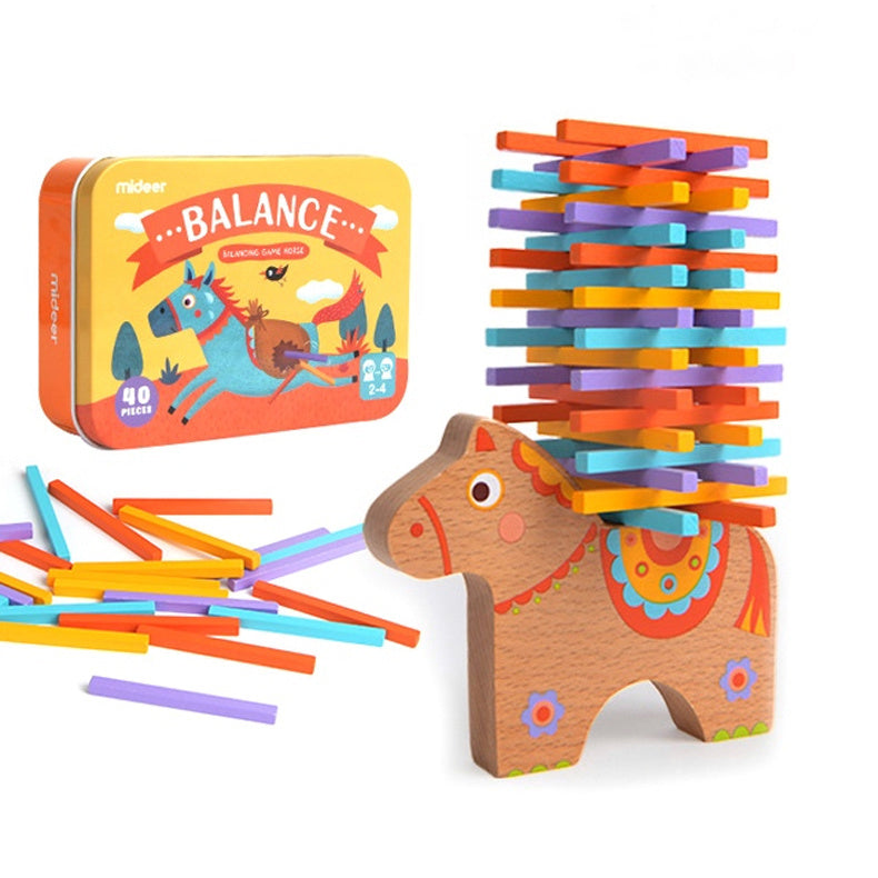 - This game features a wooden horse and 40 pieces colorful blocks.