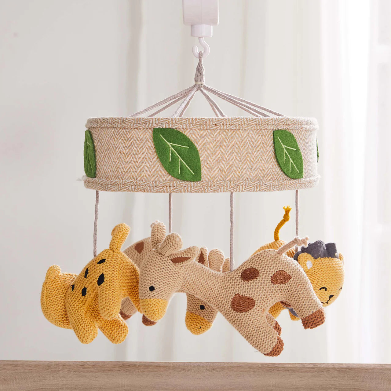 LEVTEX BABY ZUMA : A beautiful accessory for any baby nursery, the Zuma mobile features 2 giraffes, one lion and one cheetah intricately knitted and hung from a taupe ccircle with green appliqued leaves and a taupe sleeve. Featuring a rotating array of lullabies and nursery rhymes, the mobile will entertain for hours.