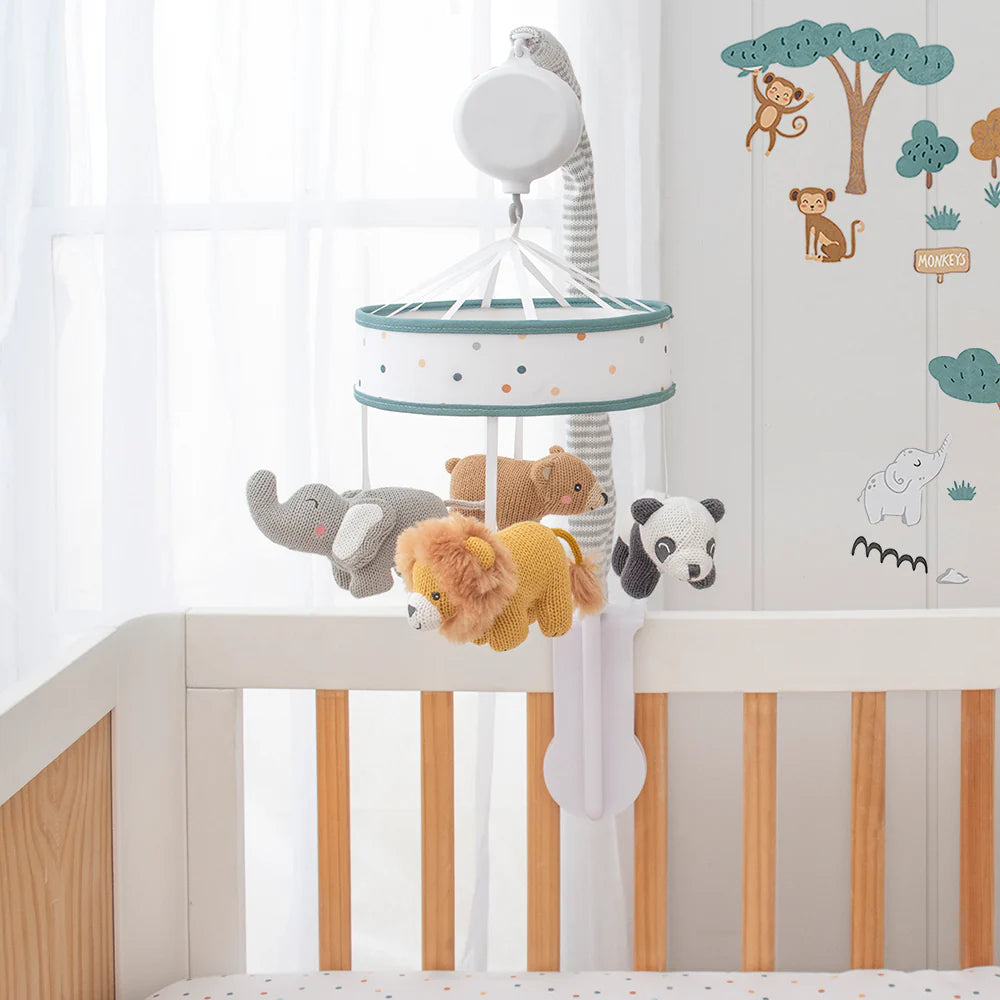 Little ones are going to love watching these zoo animals overhead to Brahms lullaby as they drift off to sleep. This gorgeous musical crib mobile features 100% cotton knit animals with exquisite detailing and is the perfect finishing touch to your nursery.
