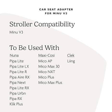 • TRANSFORM YOUR MINU: Create a from birth solution or a travel system on your Minu V3 stroller. Adapters allow for attachment of select Maxi-Cosi, Nuna, and Clek infant car seats on Minu V3 stroller only.