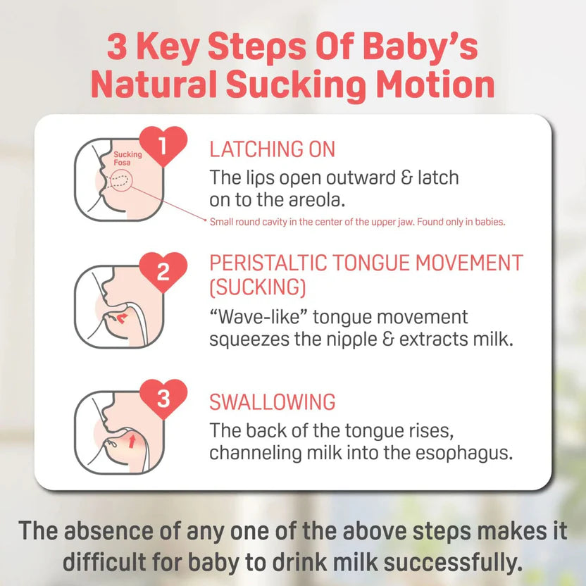 RESEARCH ON BABY'S SUCKING BEHAVIOR: The nipple is designed based on research conducted in Japan, focusing on the three key factors of sucking: latching, peristaltic tongue movements, and swallowing.