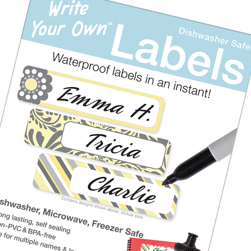 Our Write Your Own blank labels are a great last minute labeling solution. Write on the waterproof labels with a permanent marker or pen then seal in your writing with the built-in laminate. Dishwasher safe, non-PVC and BPA-free.