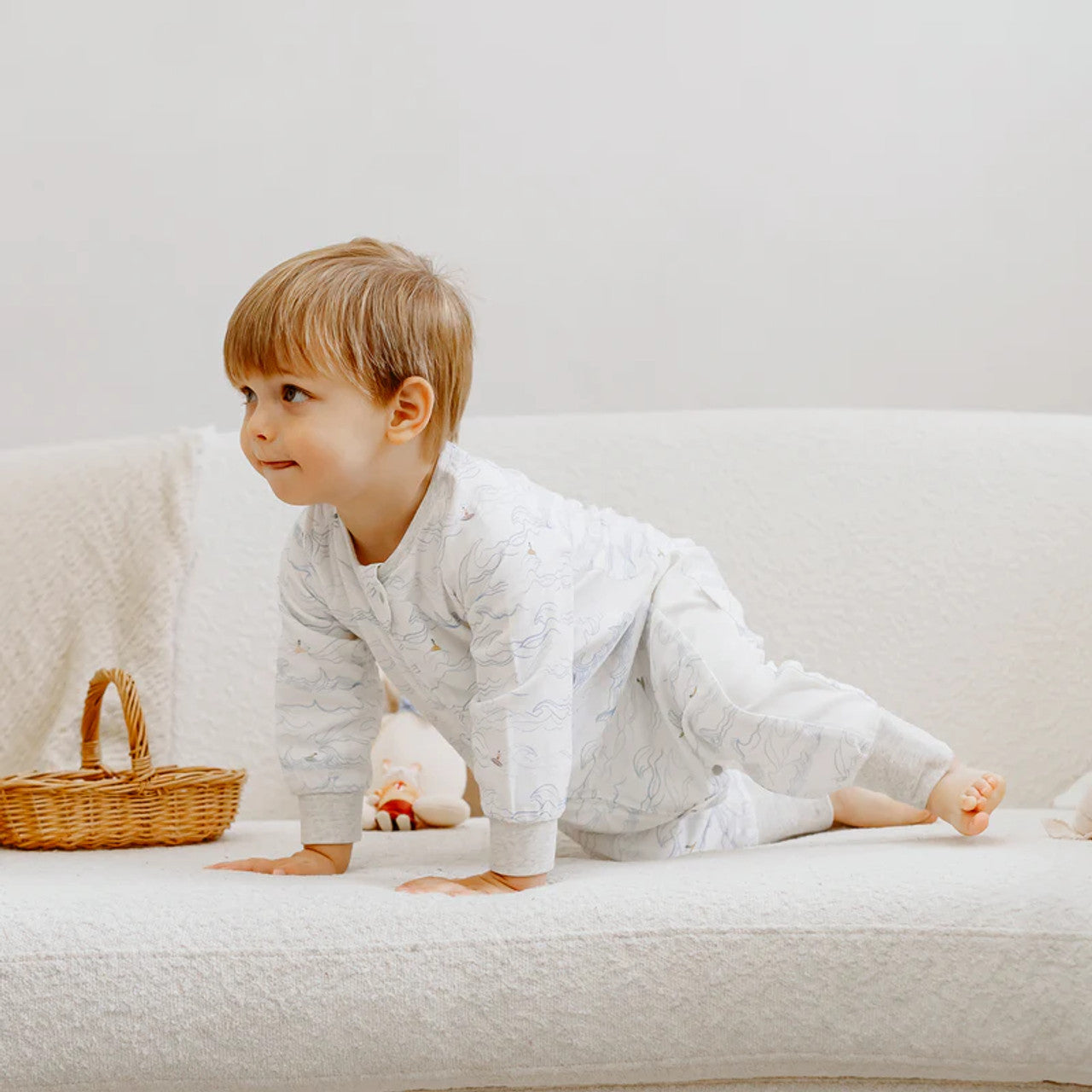 This soft bamboo sleep suit keeps kiddos cozy while they snooze and is the perfect transition piece from sleep sack to big kid blanket.