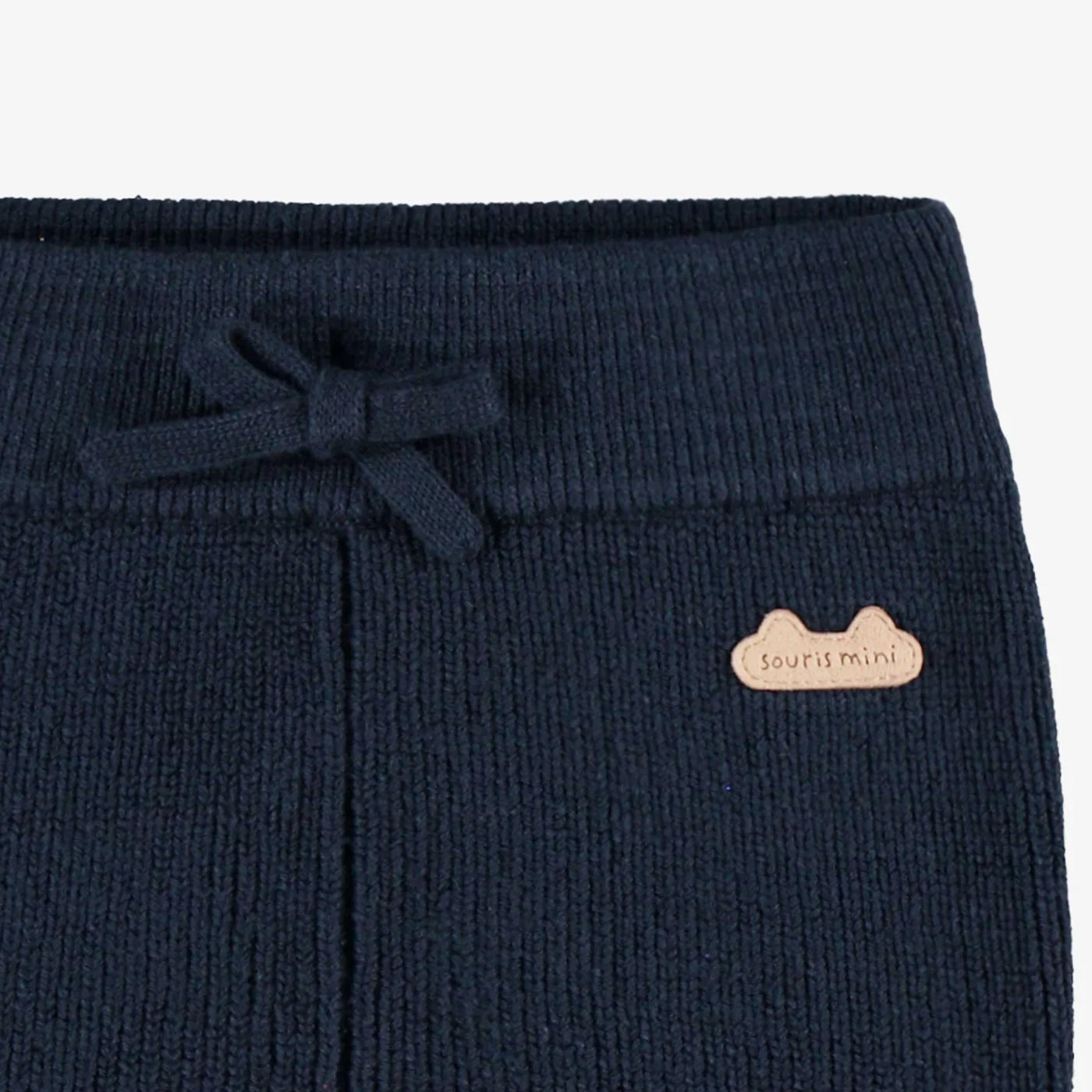Perfect for comfy outfit, these navy blue knit pants feature a ribbed waistband and cuffs for a snug fit. A small decorative bow at the front adds an adorable touch.