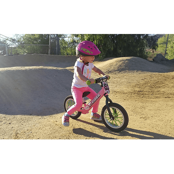 Includes 1 Pink Strider 12 Sport Bike that features never flat, no-maintenance tires, 6.7 pounds (3 kg), handlebar pad, built-in footrests, no-tool assembly, handlebar height: 46 - 56 cm (18-22 in.), seat height: 28 - 48 cm (11 - 19 in.) and steel frame.