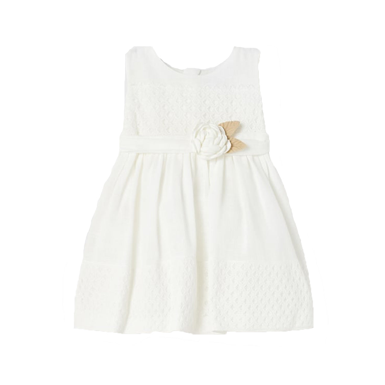 Sleeveless dress for baby. Opening on the back with an invisible zip. Made with delicate bobbin lace for the most special occasions. Made using a mix of carefully selected fabrics combined to create a different, unique design.