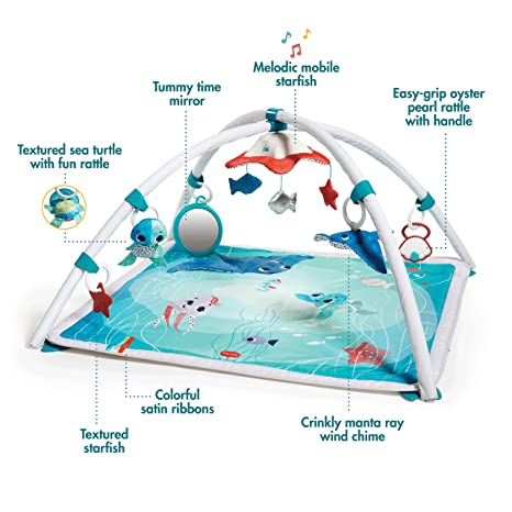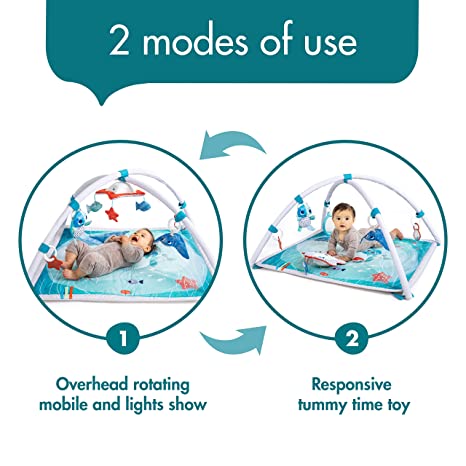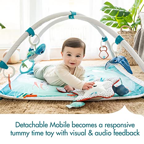 The Treasure the Ocean 2-in-1 Musical Mobile Gymini, the most recent addition to the brands activity gym category, is a uniquely designed baby gym that comes with a delightful musical starfish mobile. The magical ocean blue design, fashioned with a special aquarelle technique and an enchanting blue-turquoise palette, creates a beautiful environment for babies to play and grow. Featuring a unique 2-in-1 mobile and tummy-time tapping toy starfish, this aquatic Gymini is essentially a musical mobile Gymini. As an overhead mobile, the starfish offers charming sea and ocean sounds, a delightful light shows and a selection of 6 melodies, one of which was especially composed by our very own music therapist. With an array of advanced features, such as auto OFF timer, 5 LED lights with fade out effect and more, this adorable starfish mobile will engage babies while fostering senses and cognitive development. When used in tapping mode, the starfish will distract little ones from the effort of staying in tummy time and support their motor skills, helping them advance towards the next milestone.