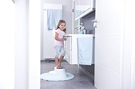 • Stable and stylish footstool for children with elegant lines, 2 steps and large anti-slip surface, For everyday use, Ideal for reaching the sink or toilet, Practical seating area