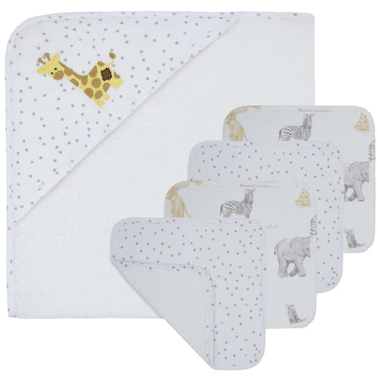 This gorgeous 5-piece bath set from Living Textiles is made from 100% cotton. Soft and smooth against baby's delicate skin, our 100% cotton hooded towel and washcloth set will add a bit of luxury to baby’s bath time. Perfect as a gift and for new parents, this sweet 5-piece set includes a gorgeous embroidered baby giraffe hooded towel and 4 terry towelling washcloths backed with jersey cotton, all presented in a gift box.