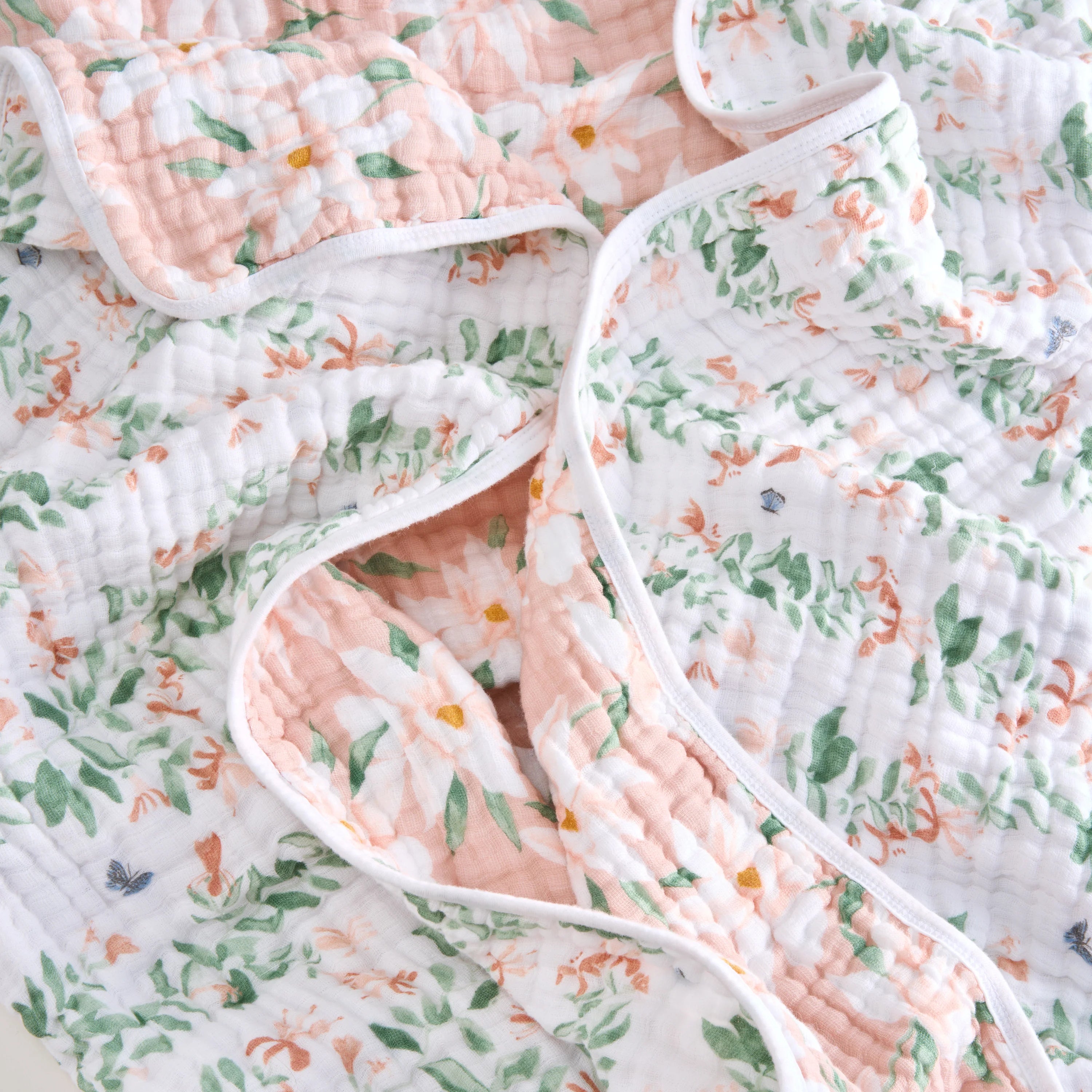 Four layers of cotton muslin create the perfect cozy cloud for your little. Our blankets are soft, warm, absorbent + lightweight - the total package! Great for snuggling, tummy time, picnics, or walks in the stroller.