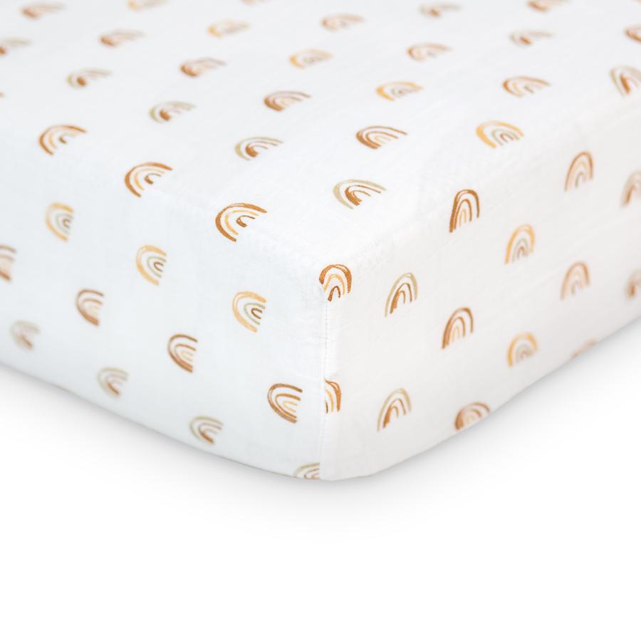 This beautiful crib sheet is designed to fit a standard size crib mattress. Made with our premium 100% cotton muslin, it features a print from our Boho collection that will compliment baby's stylish nursery. Made with breathable cotton muslin that gets softer with every wash. Matching change pad cover sold separately.