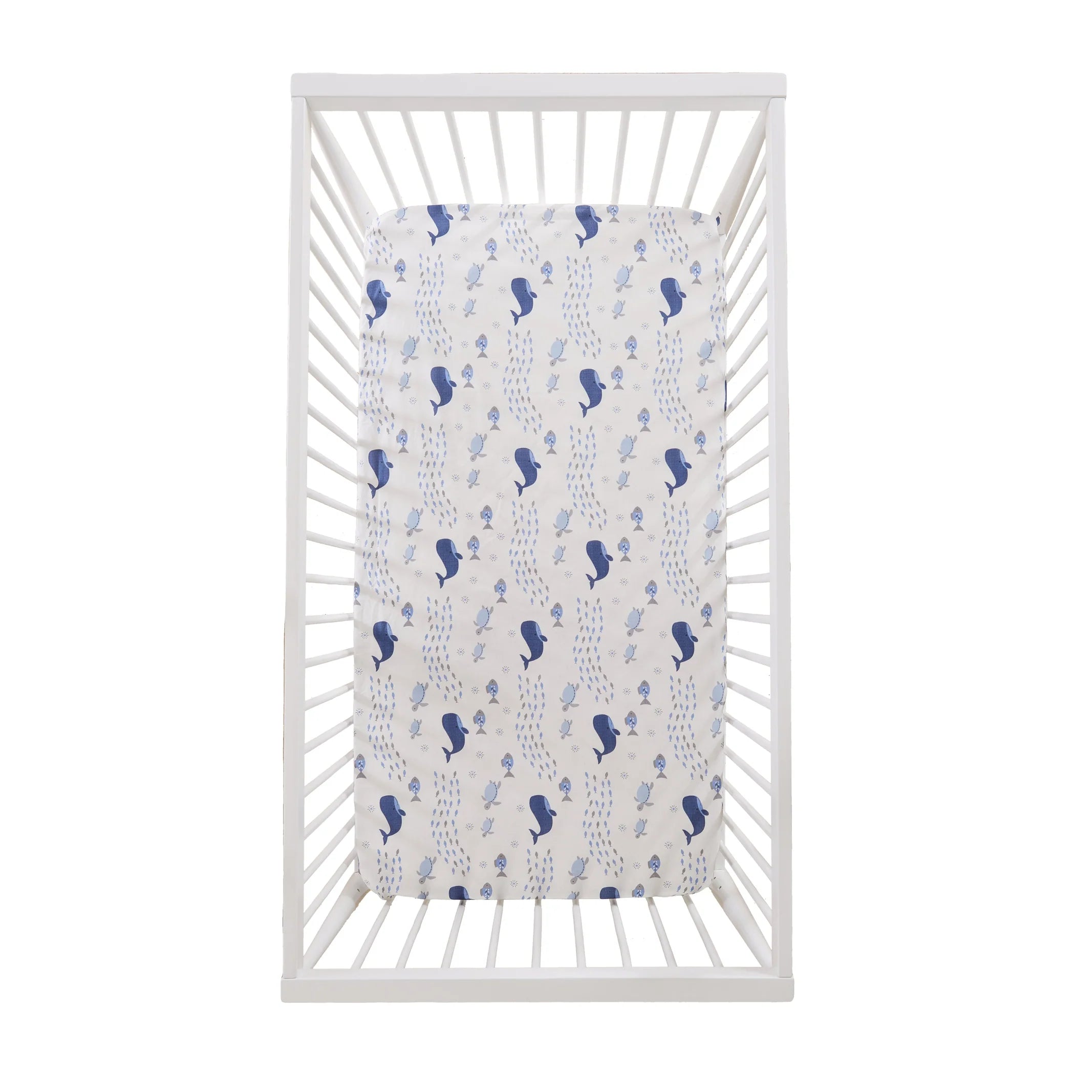 Your baby will rest peacefully on the Levtex Baby Boho Bay Fitted Crib Sheet. This fitted sheet is covered in majestic whales in a wave-like patterns with fish and turtles in shades of blue and grey. This 100% Cotton fitted sheet is gentle on your baby's soft skin and features elastic edges so that it fits snuggly around a standard-size crib mattress, staying in place until you remove it for cleaning. This sheet will transform your nursery, adding fun and playful accents. Enjoy for years to come!