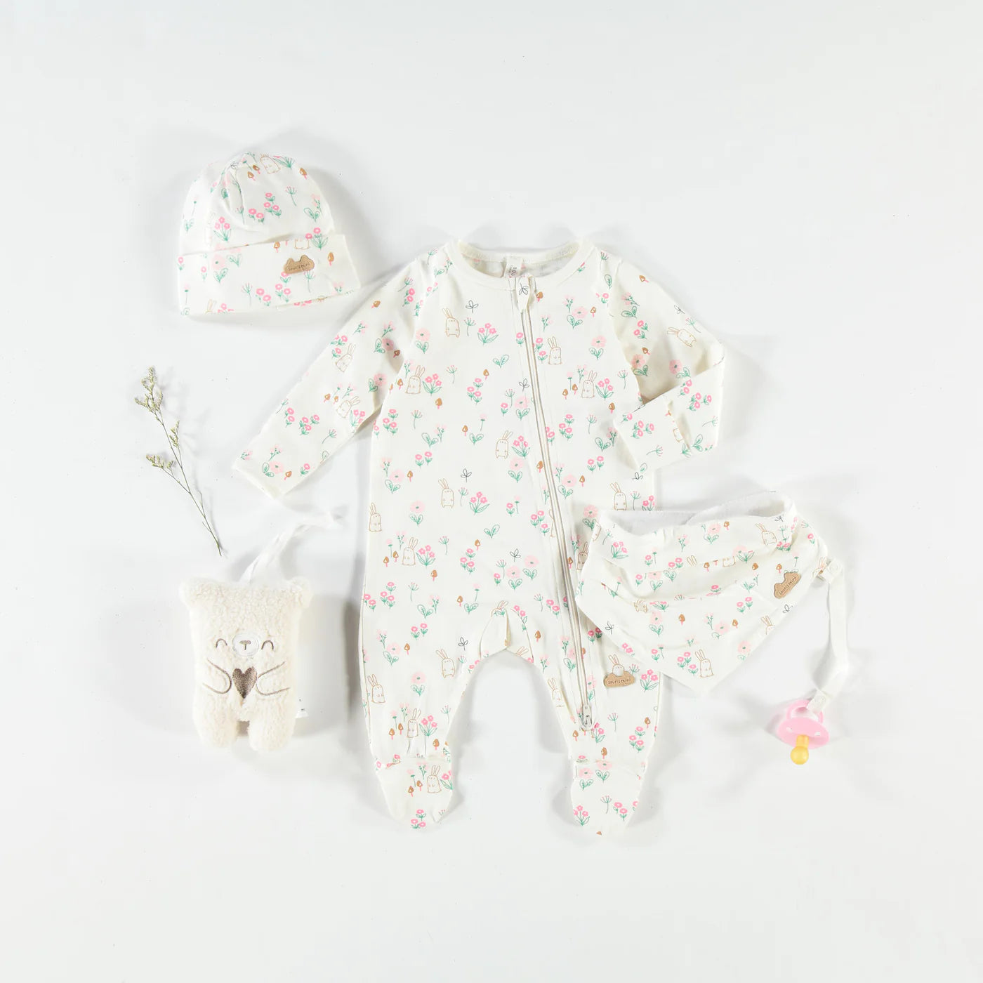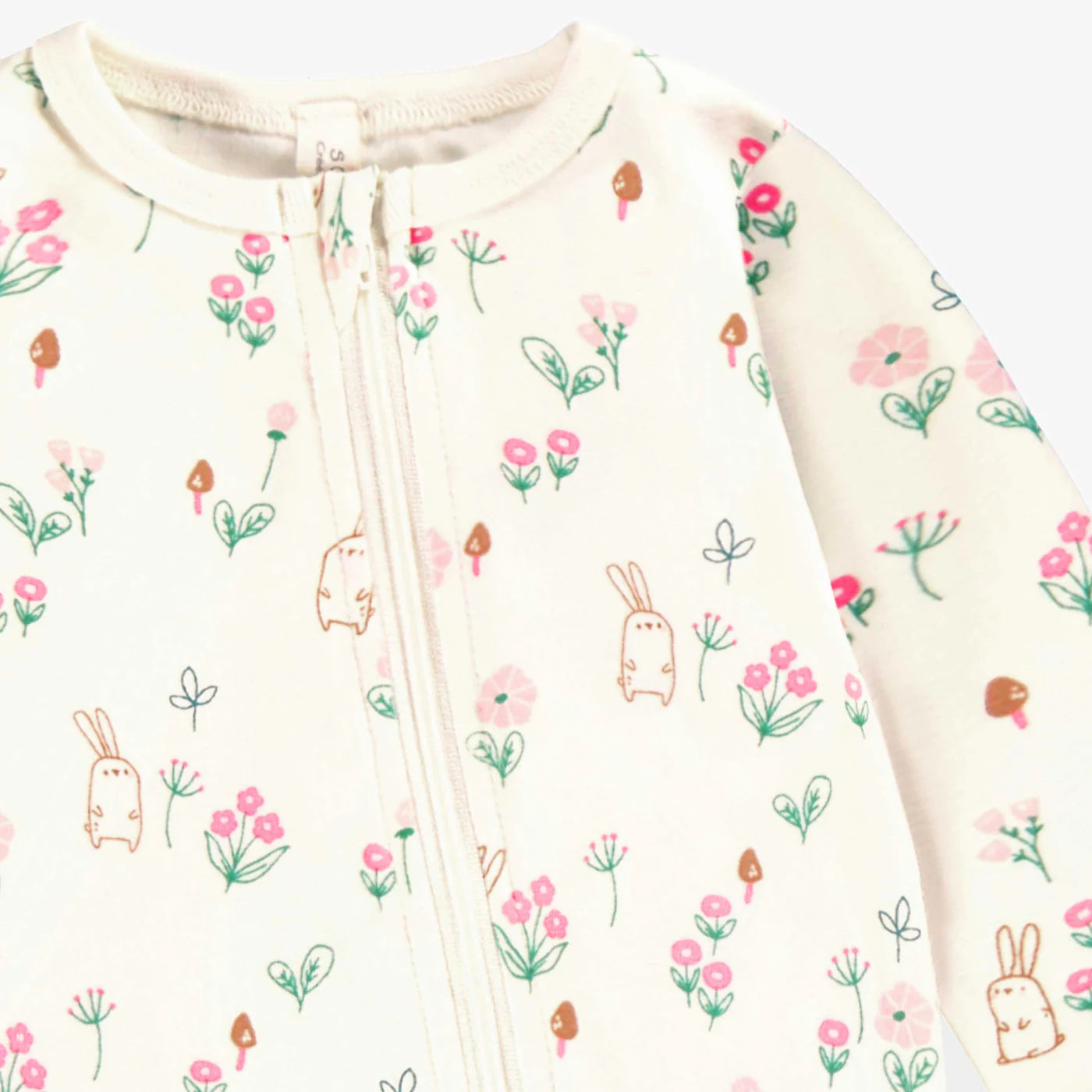 Cream pajamas with bunny and floral patterns. Features integrated feet and foldable sleeve cuffs that can be used as mittens. Designed with a zipper and a chin guard for easy dressing. Made from soft cotton for maximum comfort.