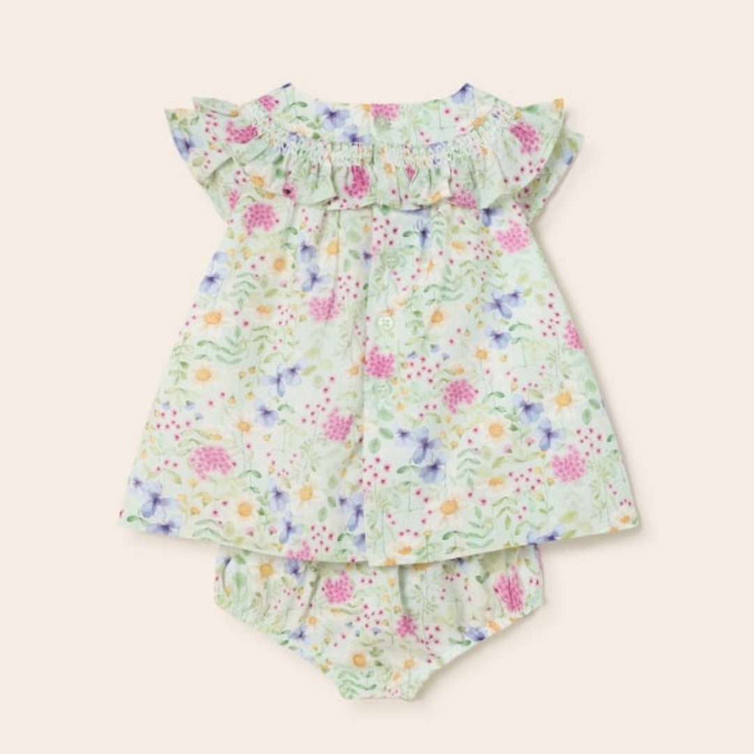 Two piece set for newborn made up of a dress with matching knickers.
