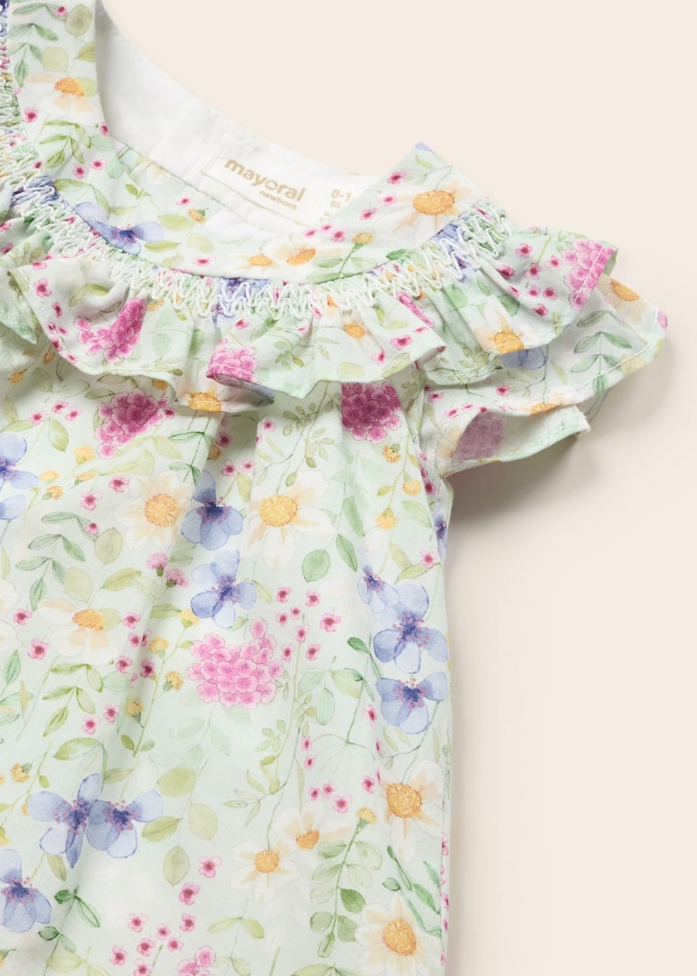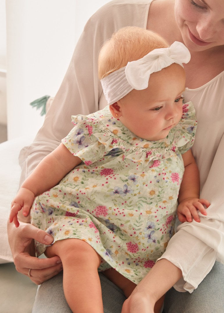 Sleeveless dress for newborn. Button fastenings down the back to allow the garment to be put on and taken off easily. Made from 100% cotton fabric. Decorative elements: decorative ruffle. Patterned design. Item belonging to our more elegant and exclusive collection used to dress the little ones on special occasions.