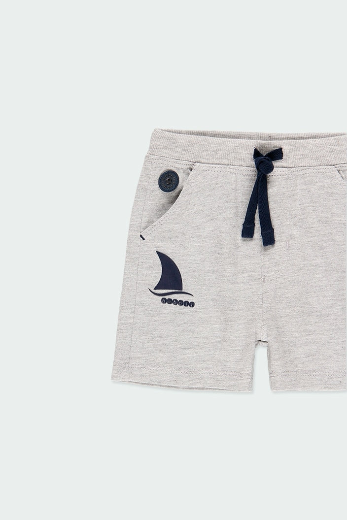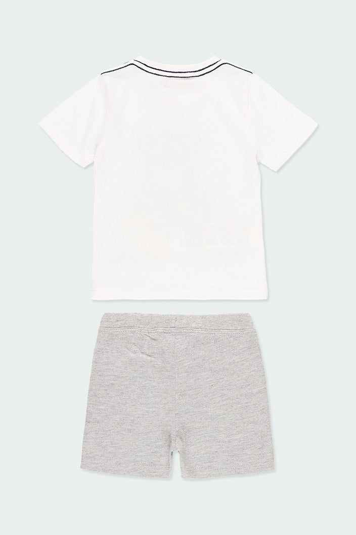T-shirt and shorts set. The plain white jersey t-shirt is decorated with a pattern in blue and yellow tones. The bermuda shorts are also made of single jersey in a heather gray color, it adjusts to the waist with a ribbed piece with inner elastic and a navy blue drawstring to regulate.