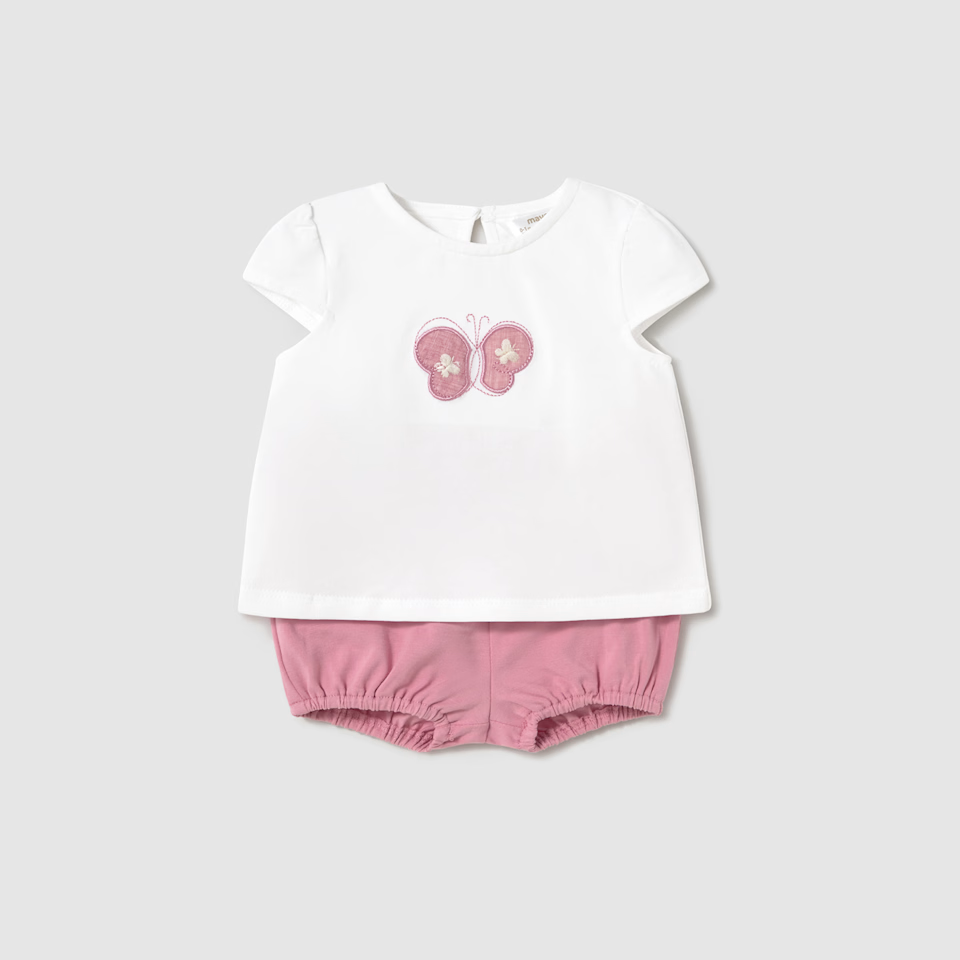 Original four-piece set for newborn. Short-sleeve top for newborn. Small back opening with button closure for easy dressing. Embroidered details. Shorts for newborn. Elastic waistband. Printed design.
