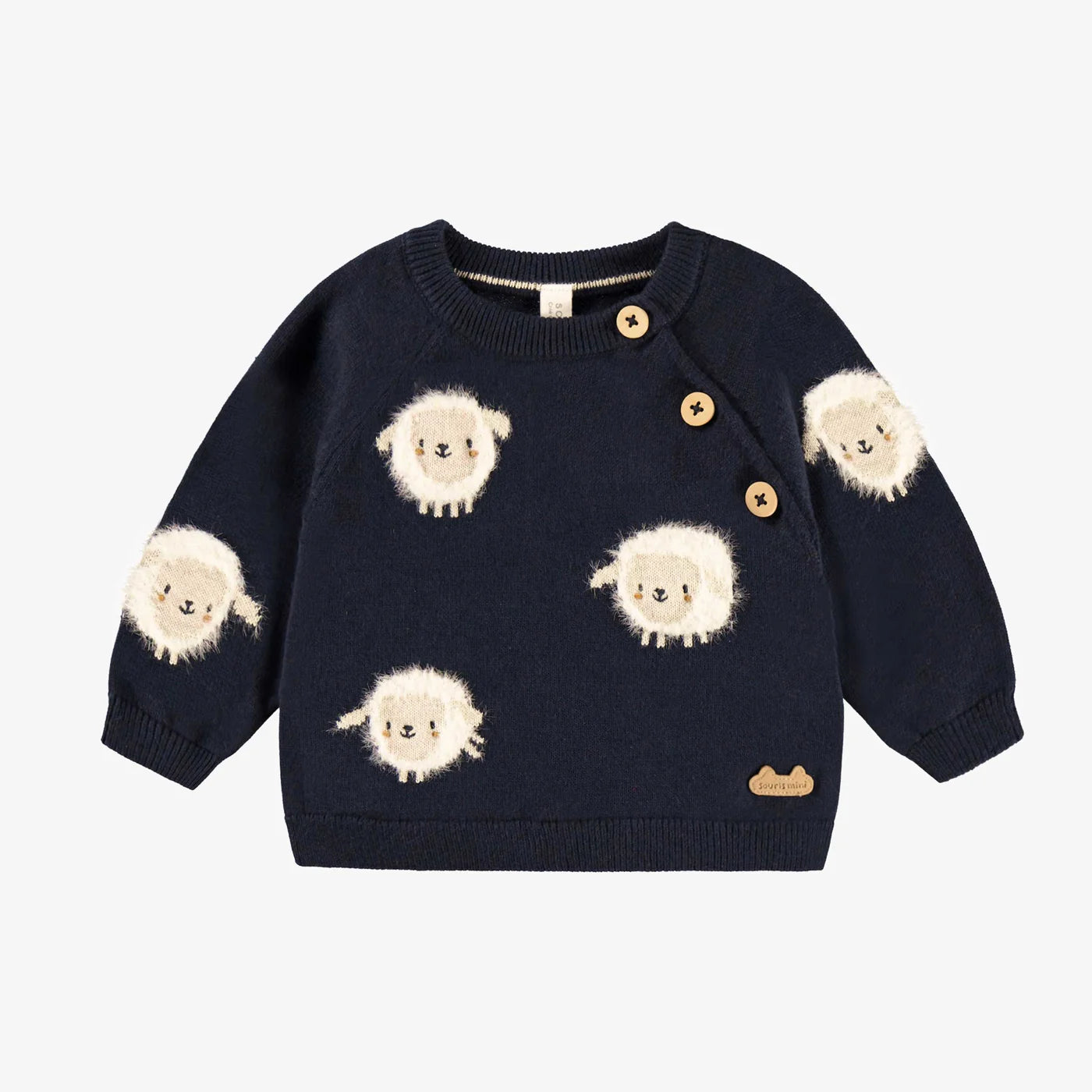 Navy blue knit sweater with adorable sheep patterns. The round neckline, hem, and cuffs are made of ribbed knit for a better fit. Features three front buttons for easier dressing.