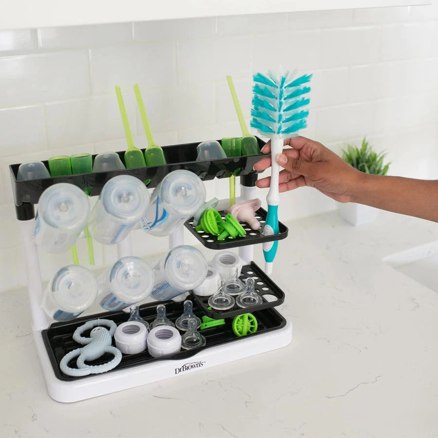 The sturdy stand-up drying rack design has the capacity of a large drying rack and can hold glass, plastic, and stainless-steel vessels up and off the countertop. Includes three trays for storing smaller accessories, and the removable bottom tray catches water from drying and allows for quick cleanup. Keep baby’s smaller feeding parts and other accessories in one place with the additional top compartment for organizing and storing.