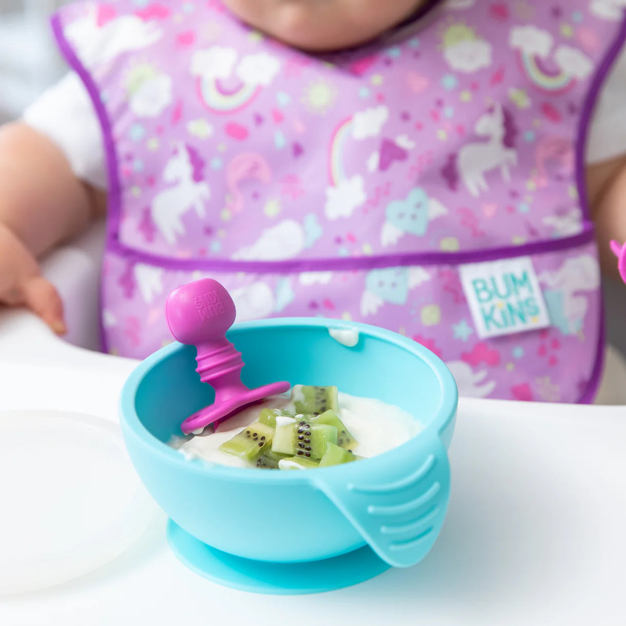 Our Chewtensils are intended for Stage 1 of baby-led weaning – introducing babies to the concept of holding a utensil and feeding themselves. We made Chewtensils from soft, textured silicone that’s easy to grip and gentle on tender gums, with bendable heads for safety. The back of the spoon head has sensory bumps to stimulate gums. They’re perfect for dipping into puréed foods at the early part of baby led weaning. Chewtensils can be chewed on by younger babies before they’re ready to transition to silverware. They’re safe to use – made from 100% food-safe silicone.