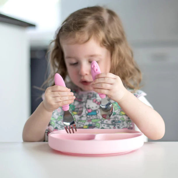 Now featuring the cuteness of Hello Kitty! Little ones can dig into mealtime with our Fork and Spoon Set. Stainless steel fork and spoon heads are sized and shaped for toddlers. The concave heads help keep food on the fork or spoon, helping promote self-feeding with solid foods. The outer fork tines are bent to help spear foods and keep food on the fork. Handles are textured silicone so they’re easy-to-grip. Safe to use – made from 100% food-safe silicone.