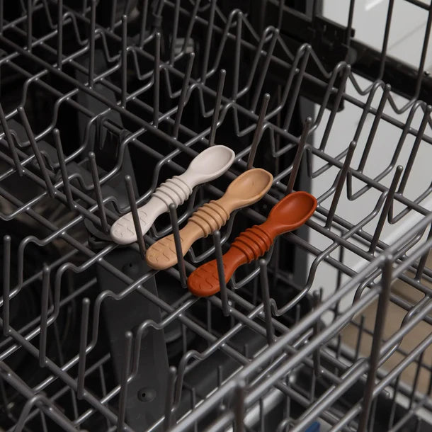Help baby become a natural using utensils with this set of desert-inspired starter spoons in a mix of rustic shades of Clay, Sand, and Wood Grain. Made from 100% food-safe silicone that is gentle on gums, these spoons are double-ended to grow with baby—one side for dipping into purees, the other for scooping. Silicone Dipping Spoons are the ideal size for a baby to begin the motions of self-feeding while under the supervision of an adult. With three in a set, there are enough spoons for both caregiver and baby to have one in hand and avoid any power struggles with independent eaters. Spoons can be used with the Bumkins Silicone First Feeding Set or separately. Easy to clean by hand and dishwasher safe.