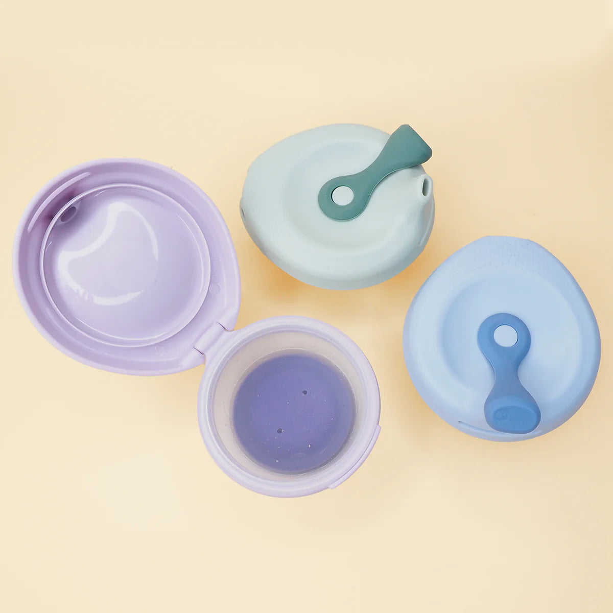 - Wide opening lets folks easily fill the silicone pouch, less mess. Lid clicks closed to contain food