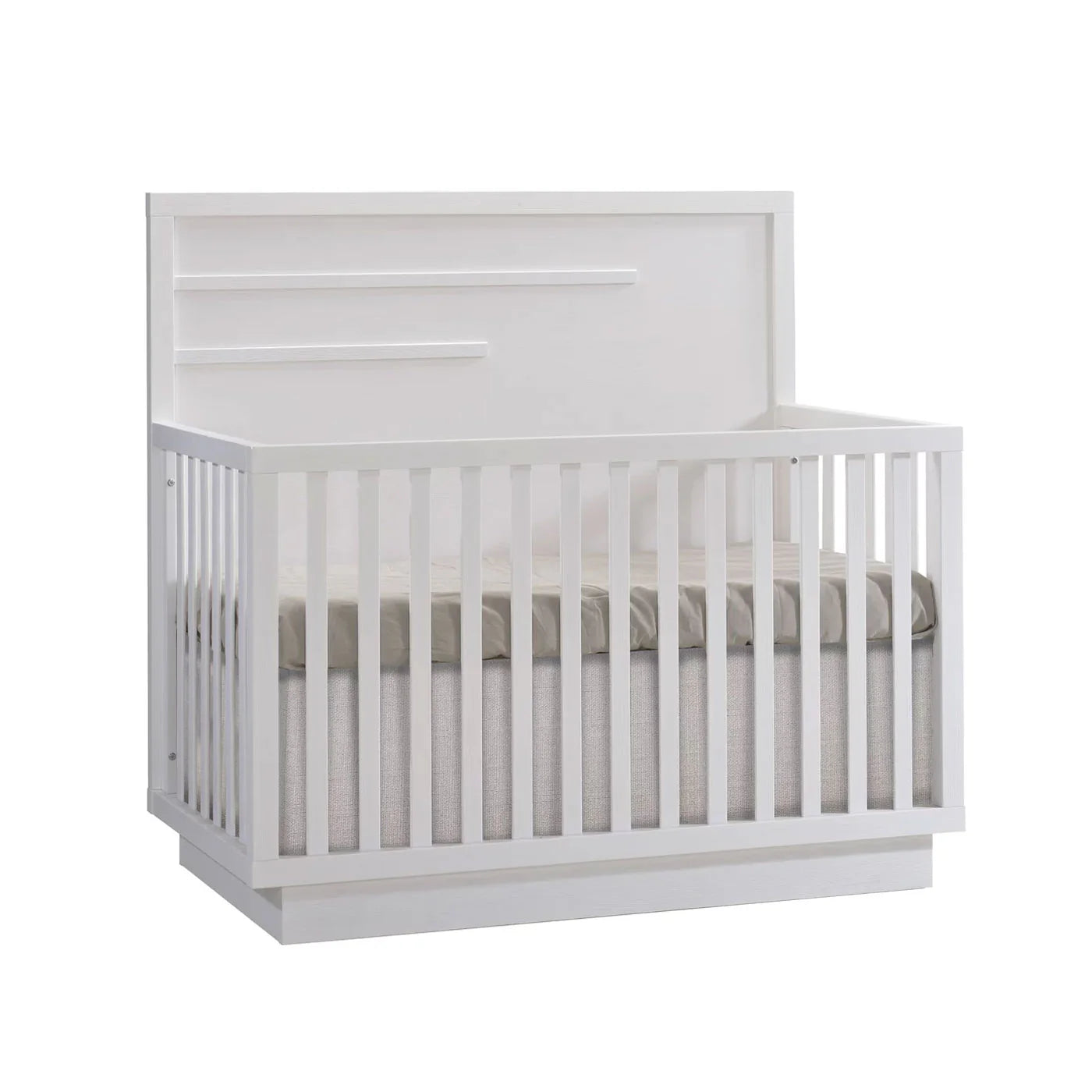 Convertible cribs with a thicker and higher 53’’ headboard available with a Wooden Horizontal molding design or a Geometric Upholstered panel design in Bouclé Beige