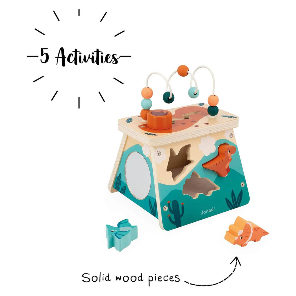 On the front, we discover a shape sorting box with wooden dinosaurs to fit into the corresponding shape. Little ones will have to think carefully about where to place the adorable Tyrannosaurus, Triceratops and Pteranodon! Retrieve the pieces easily thanks to a large opening on the side.