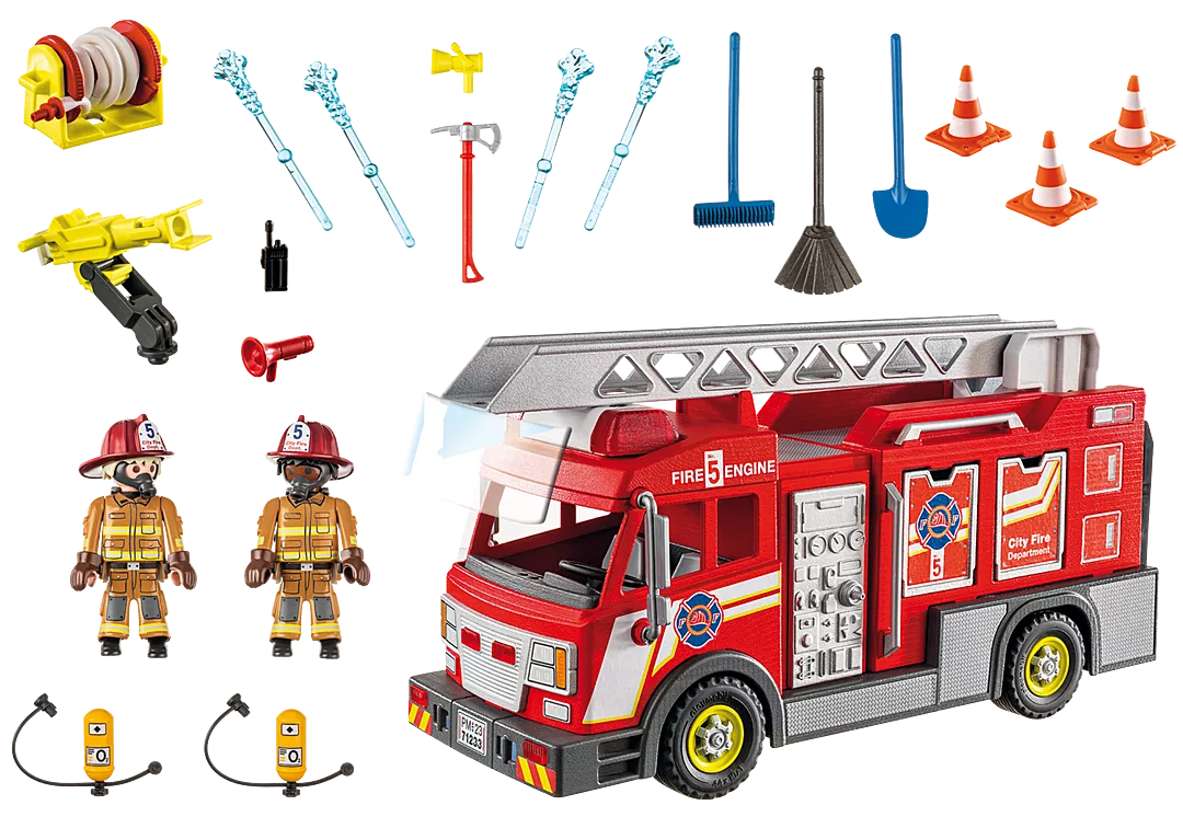 Be a hero in PLAYMO City with the PLAYMOBIL Fire Truck, featuring an extending ladder that spins 360 degrees and a rotating and swiveling water cannon to knock down the flames. The set includes four water arrows. Equip your figures with a respirator and oxygen tank for the rescue mission. Use the large compartments on both sides of the vehicle to store the mission equipment. Includes 2 PLAYMOBIL figures. Accessory elements include a fire hose, megaphone, radio, oxygen devices, fire axe, water cannon, broom, 3 pilons and a fire arm. 1 x AAA battery required. Dimensions: 12.2 x 4.9 x 14.3 in (LxWxH) (with ladder) Recommended for ages four to ten years. Warning. Choking Hazard. Small parts. Not for children under 3 years.