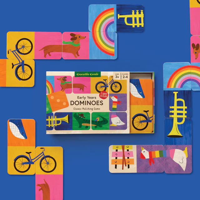Early years Dominoes classic matching game Fun and easy to play classic matching game for little kids. Includes 28 two-sided domino pieces,  side one for image matching and learning side two for number matching and learning.