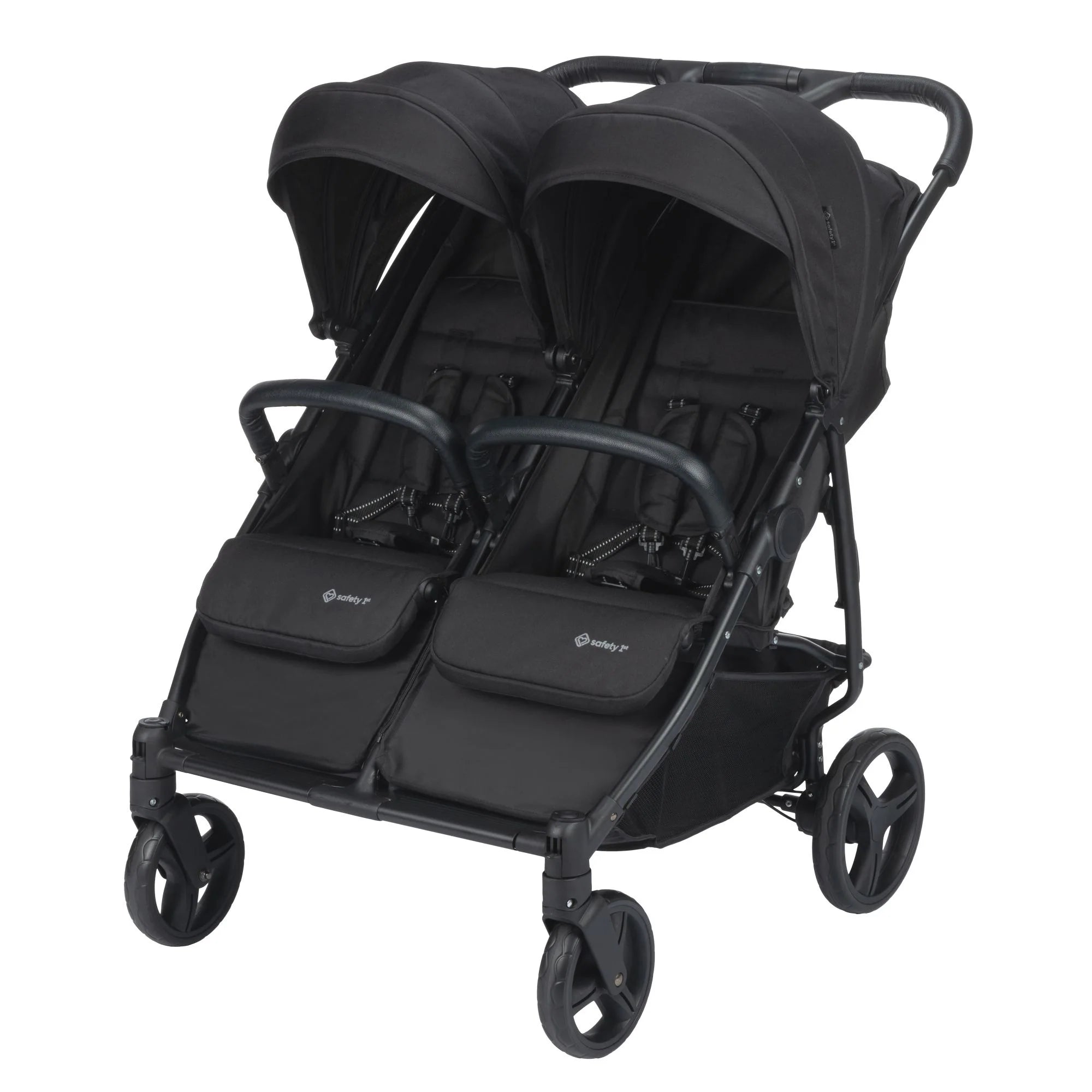 Going out and about with two little ones couldn't be easier with the Safety 1st Double Double Duo Stroller. It is lightweight at under 29 lbs, which helps when hauling two kids and their gear. Suitable for twins, or close-in-age siblings, this double stroller has everything you need to move your kids with ease. It has two independent canopies, so they cant fight over who wants shade or not. It has two reclining seats, so one can take it easy while the other can see the world. It has two independent storage baskets, so each child has their little cubby on the go. The double stroller has more features than your average single stroller: It features a one-handed fold, a single pedal braking system, extendable canopies with peek-a-boo window, and leatherette handlebars and bumper bars. It even has two parent pockets when grown-ups need their own little space. Whether you live in the city, suburb, or countryside, the Double Double Duo Stroller is the hassle-free solution for moving your family.